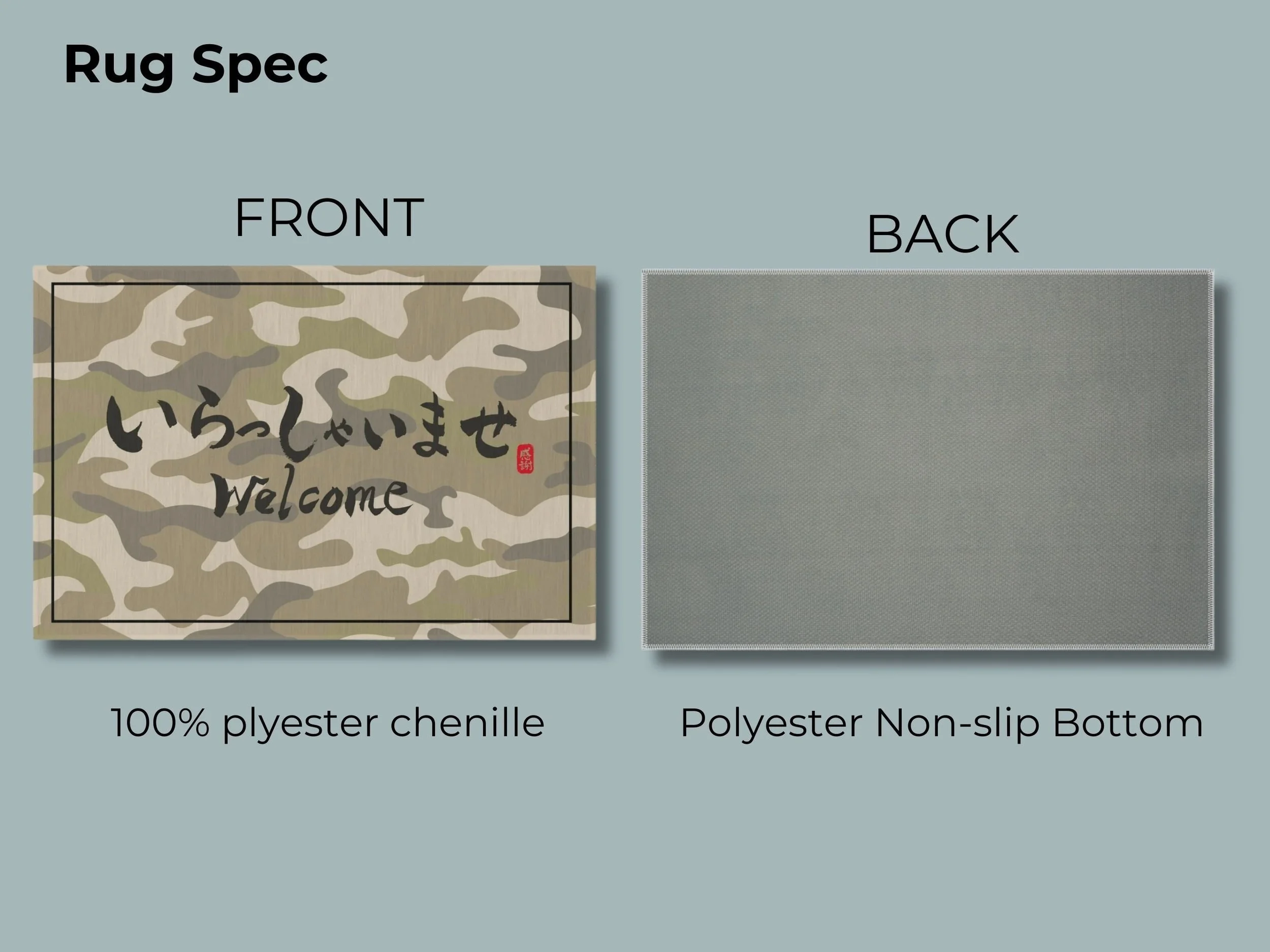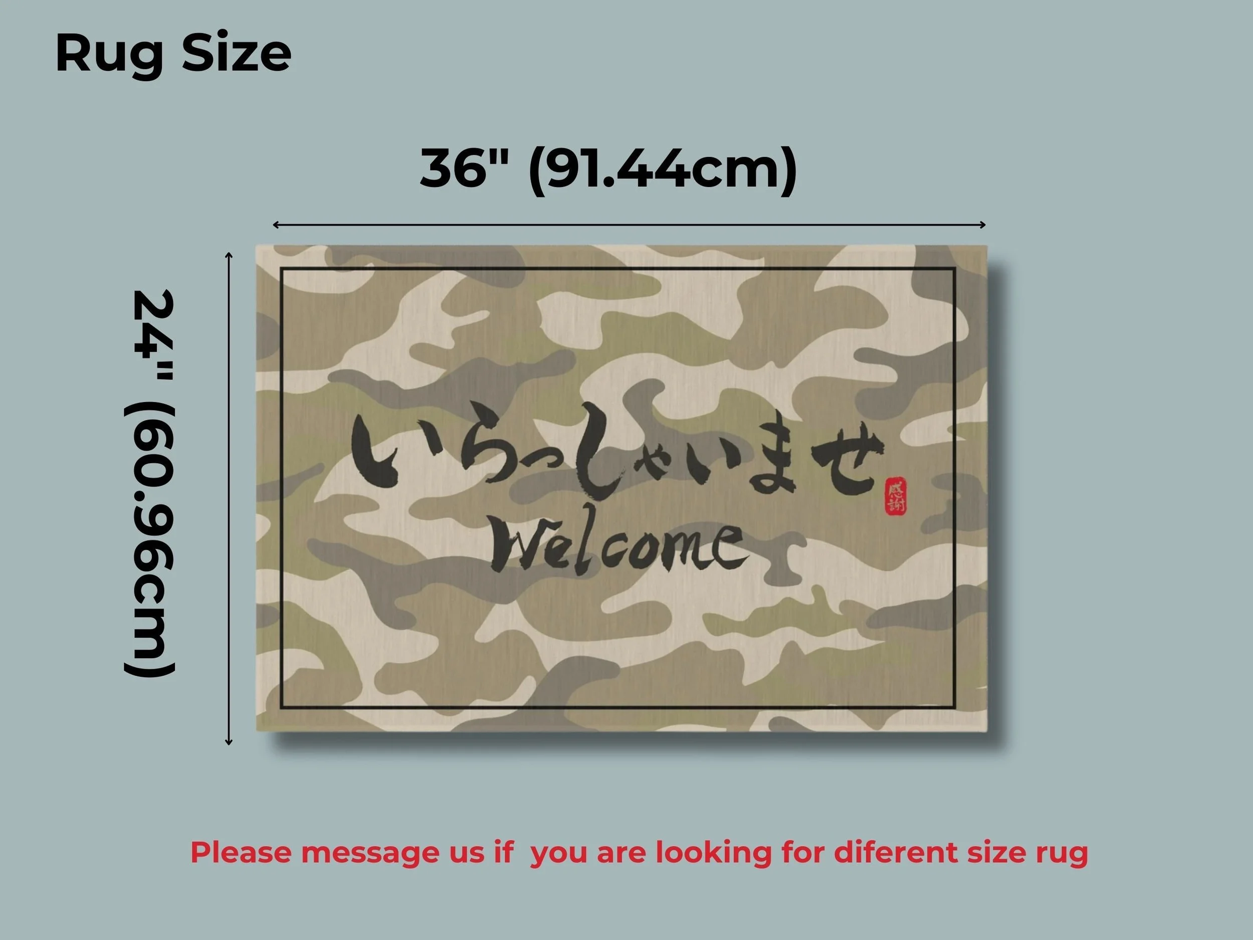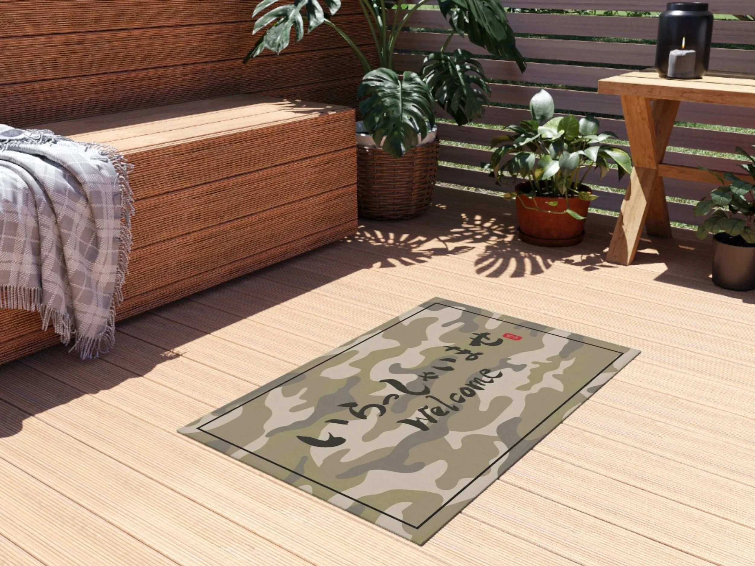 This outdoor welcome mat features a camouflage design and a Japanese welcome sign with brush calligraphy, making it an ideal entrance mat for Asian restaurants or sushi shops. It's a unique gift that combines style and cultural flair for any welcoming entrance.