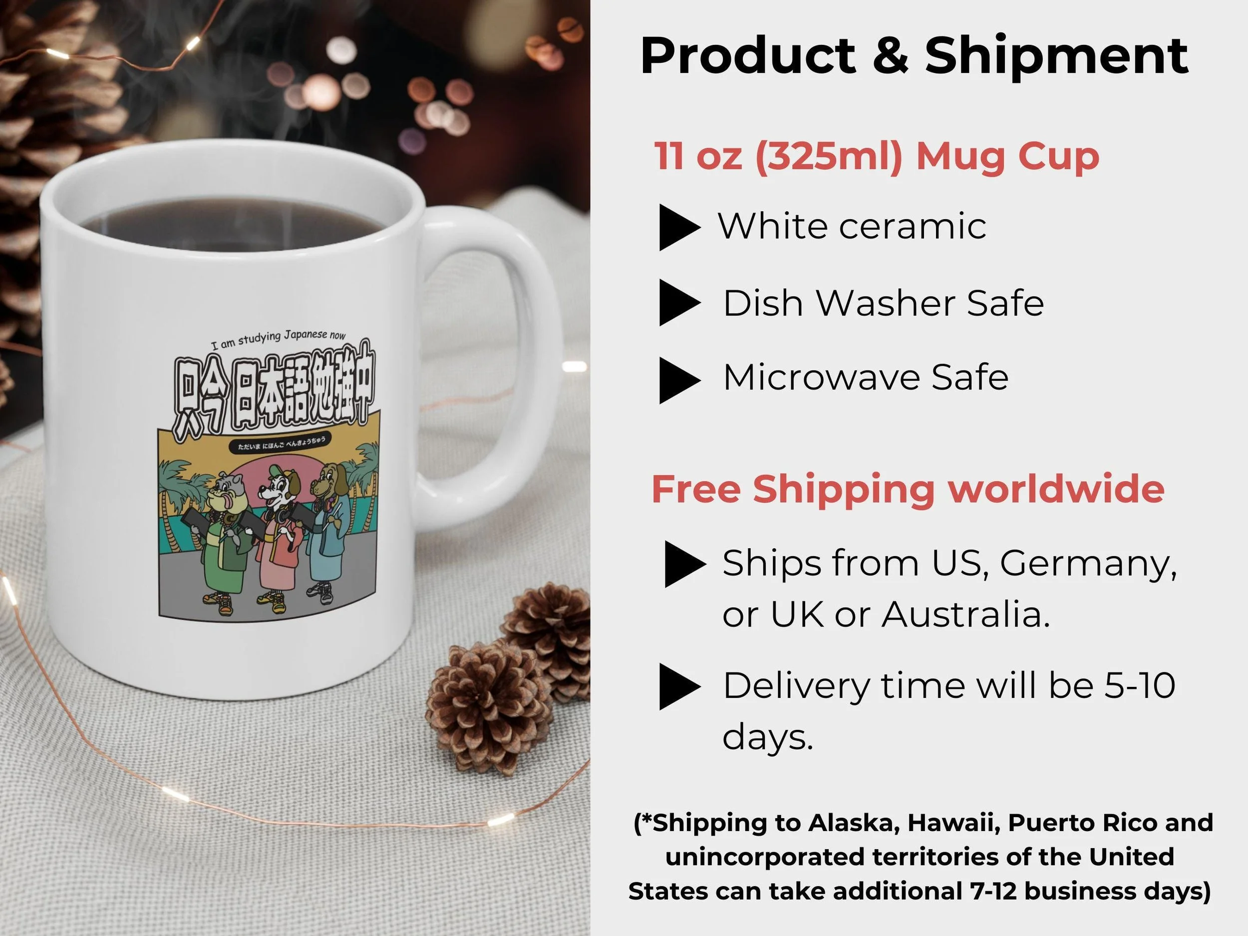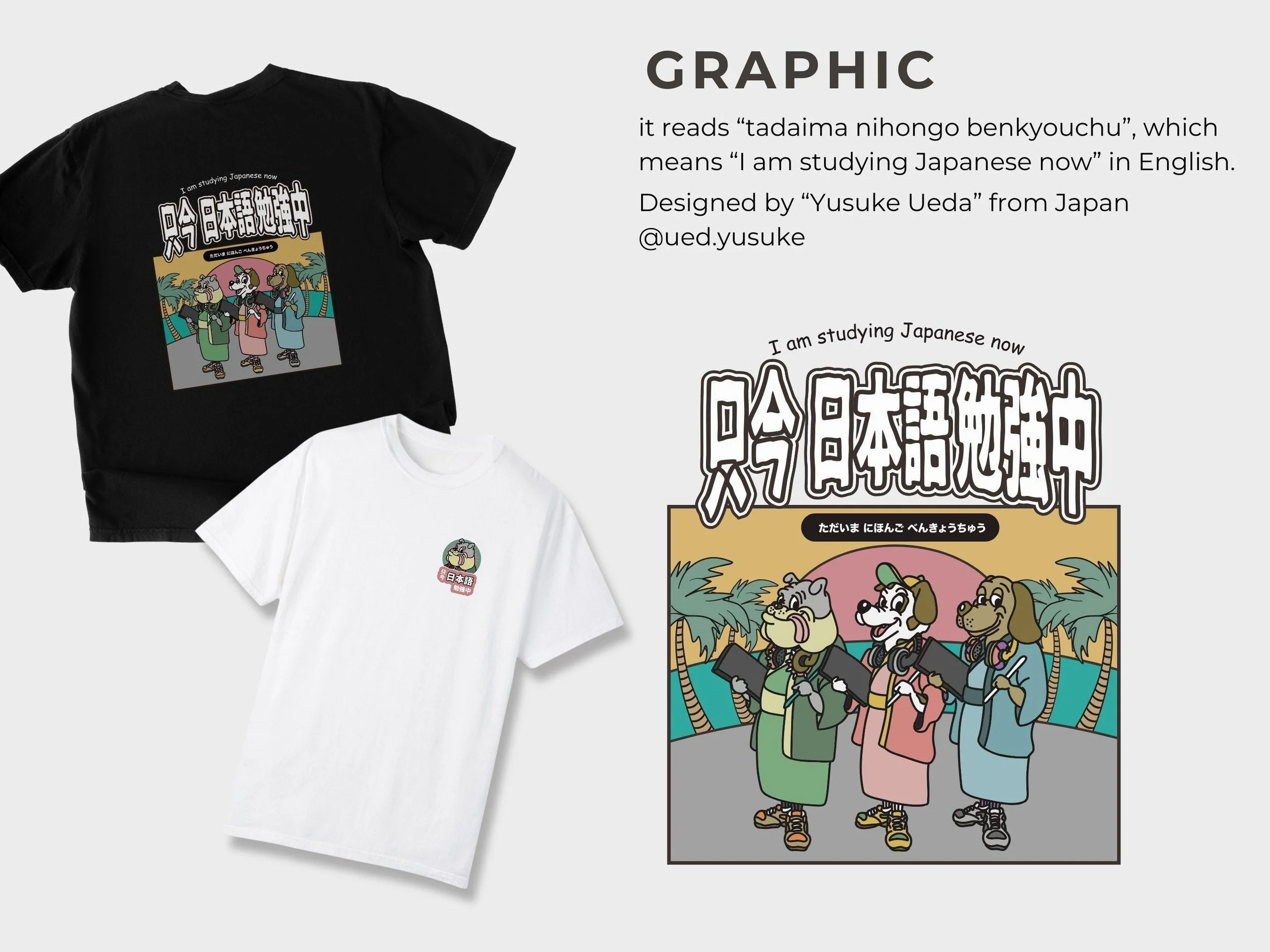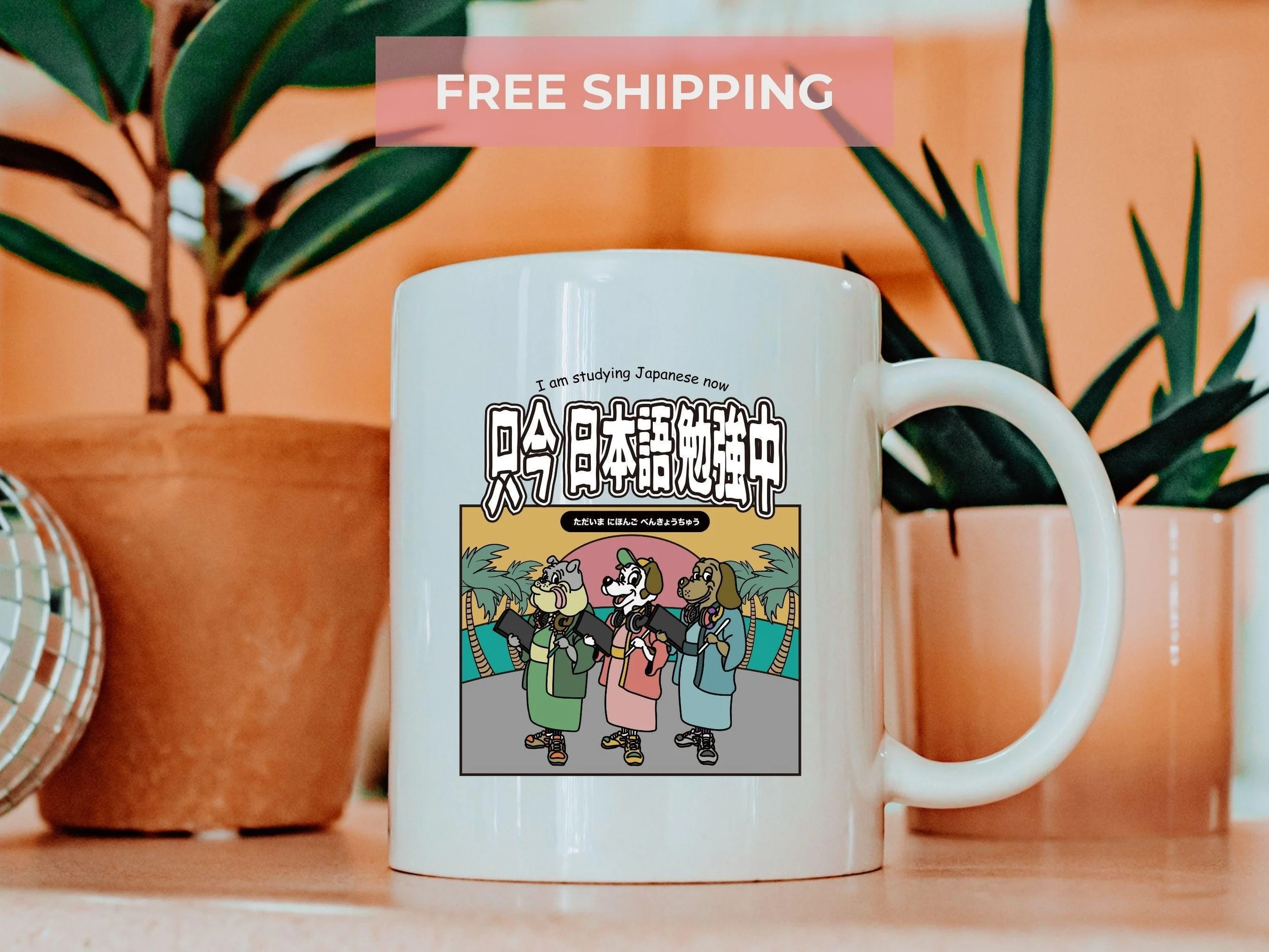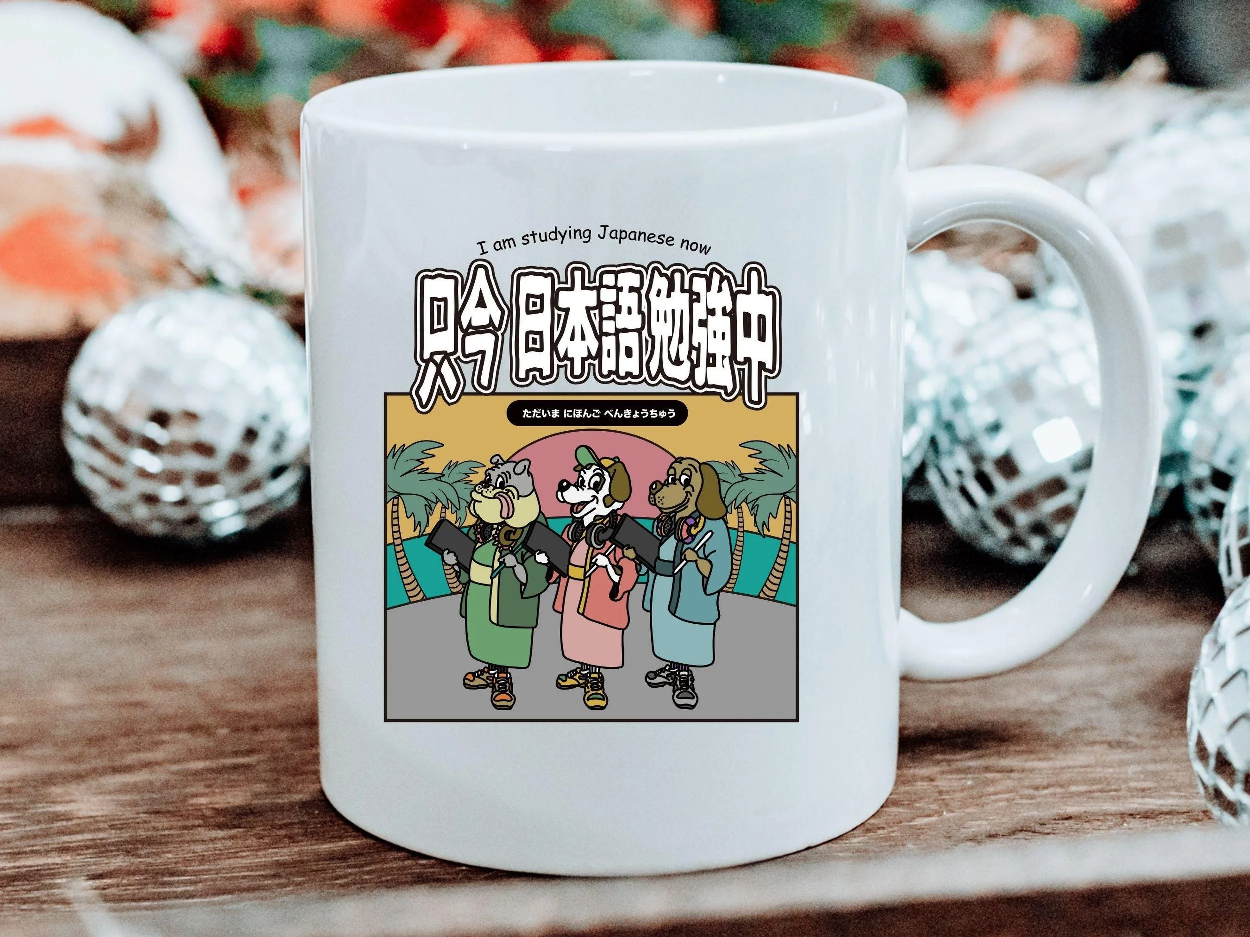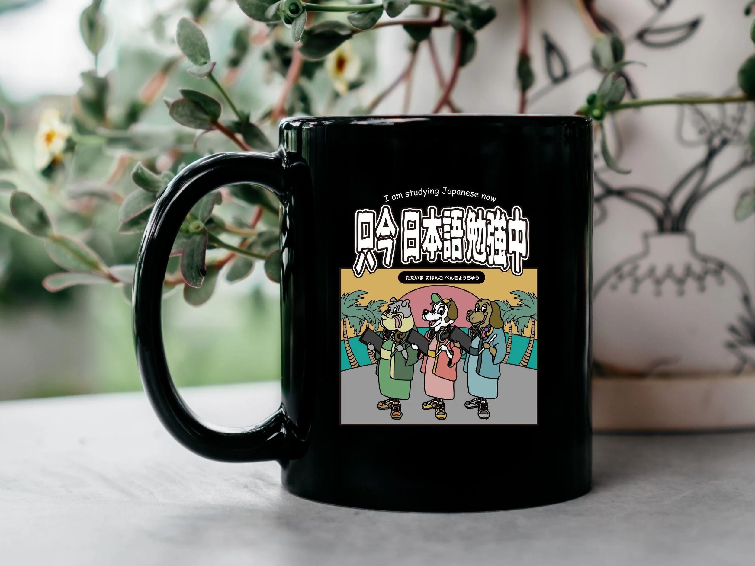 Dog graphic Mug Cup has the illustration by famous pop illustrator named Yusuke Ueda from Japan. The graphic says I am studying Japanese now with dog graphic. Great gift for anime lover, but also great gift for dog lover as well as someone who studies Japanese language.