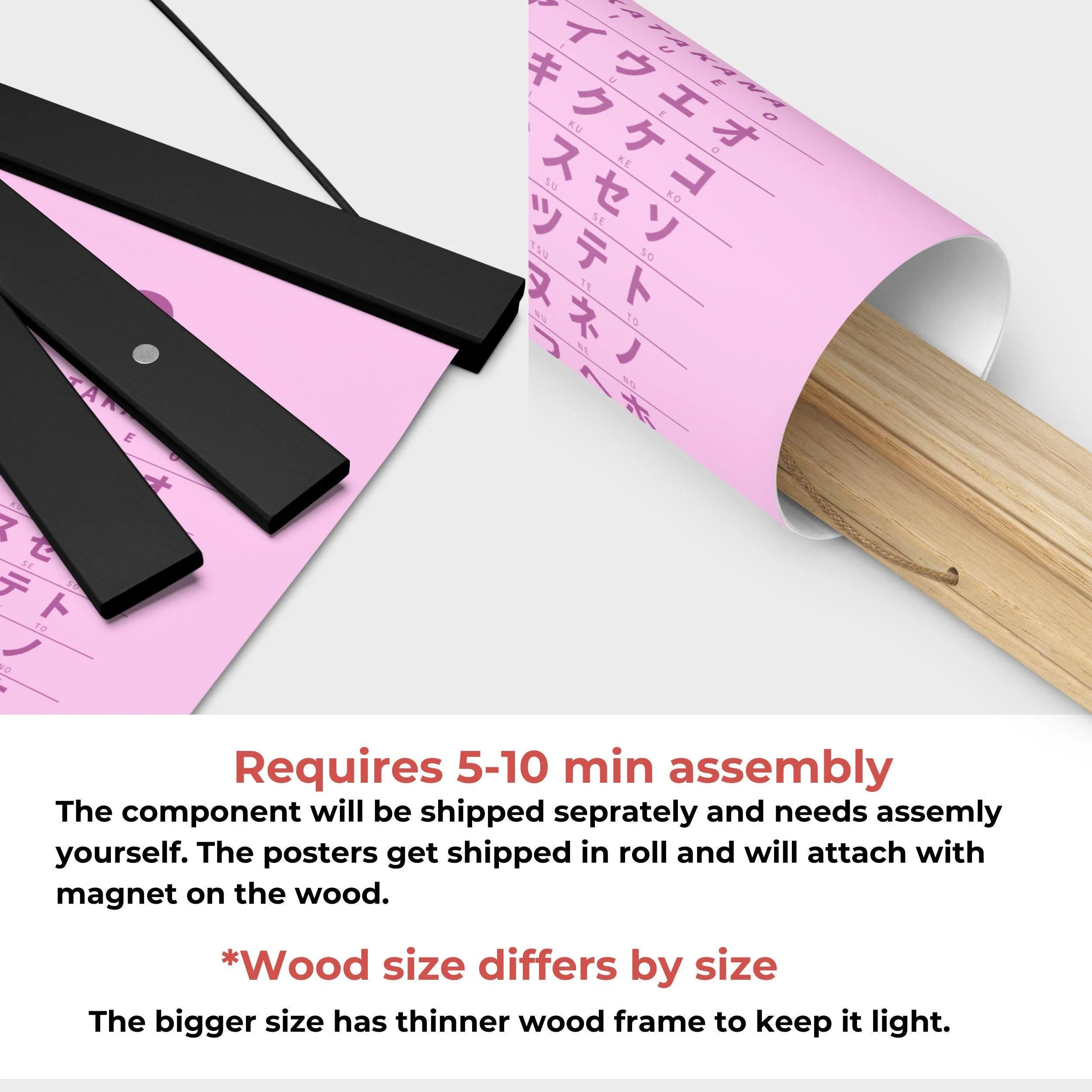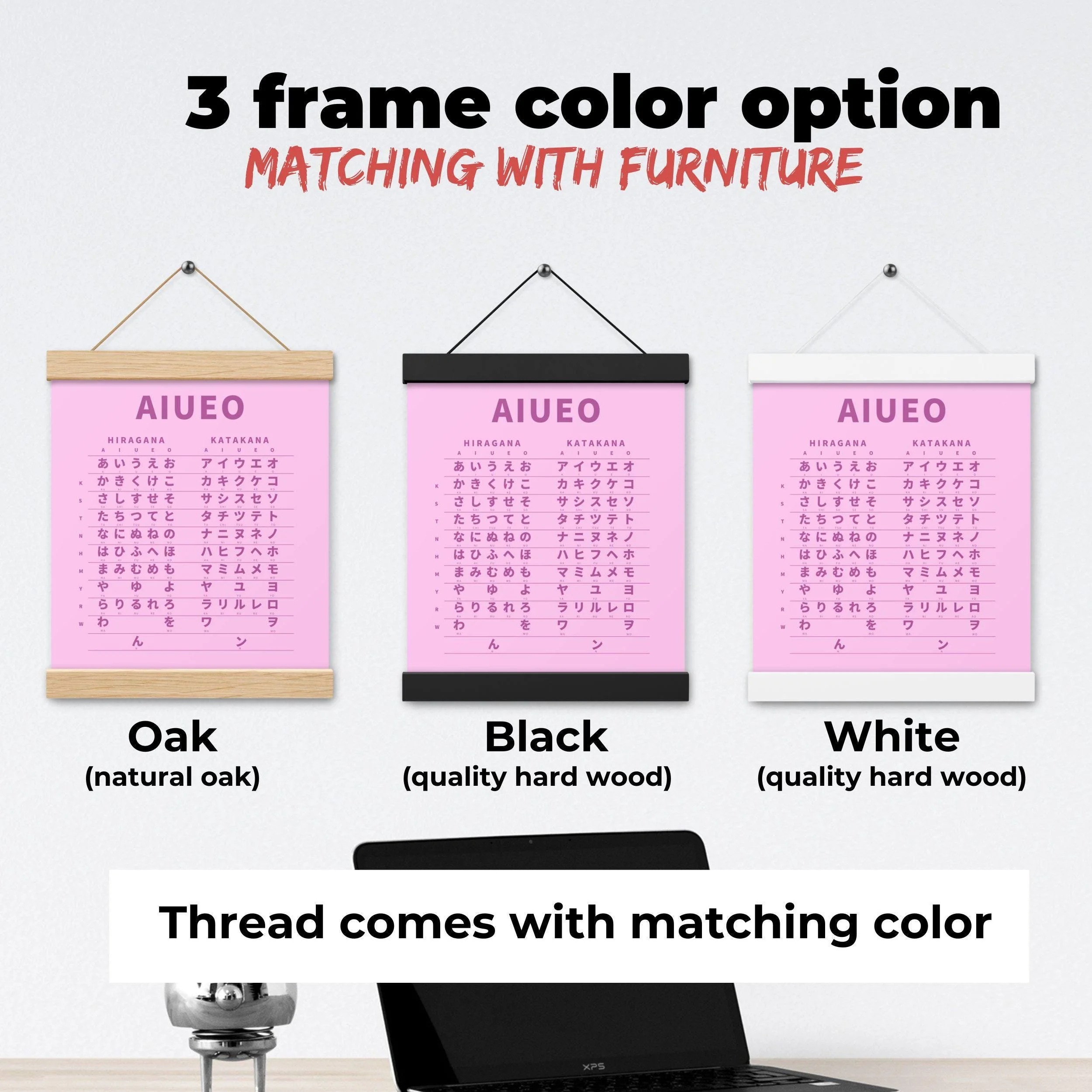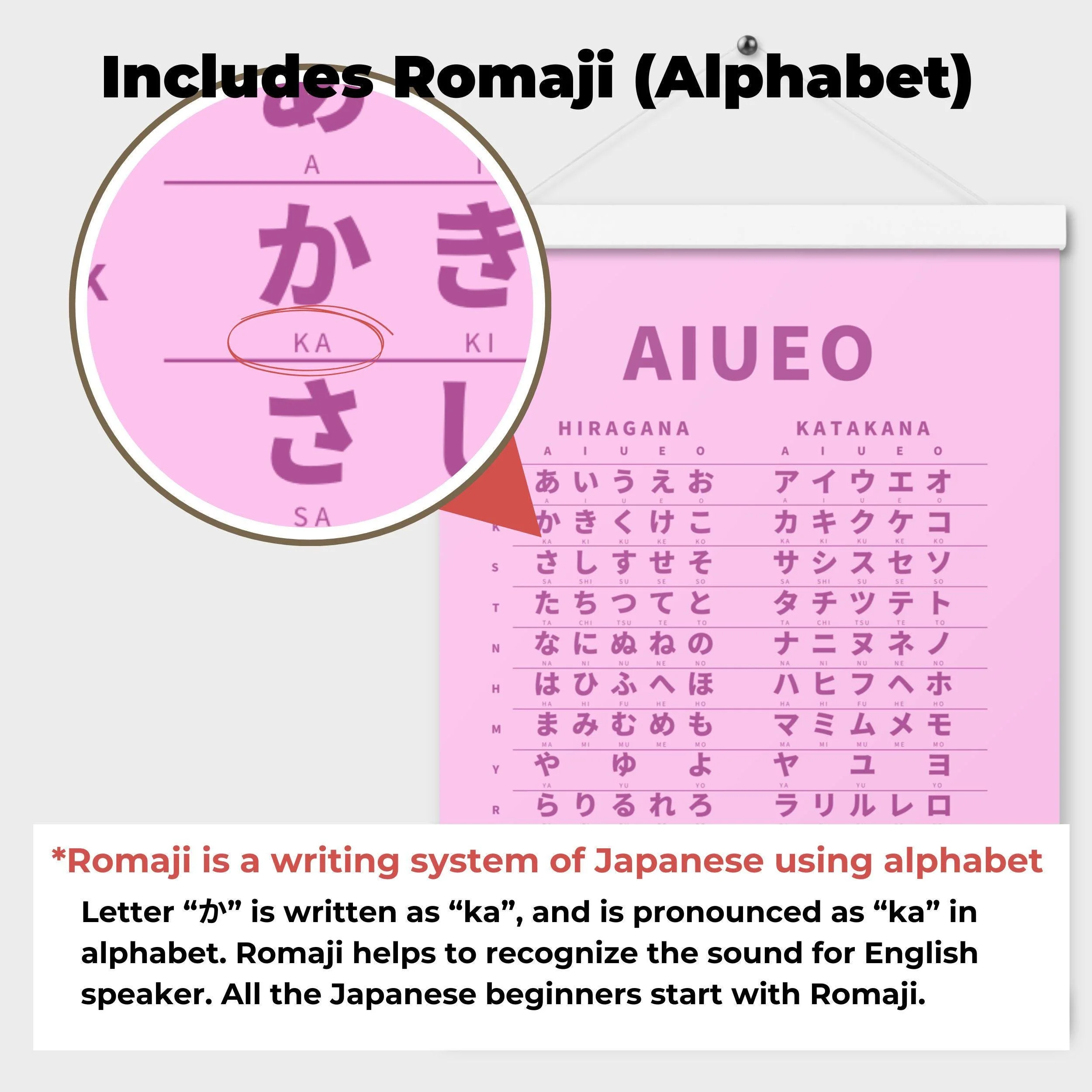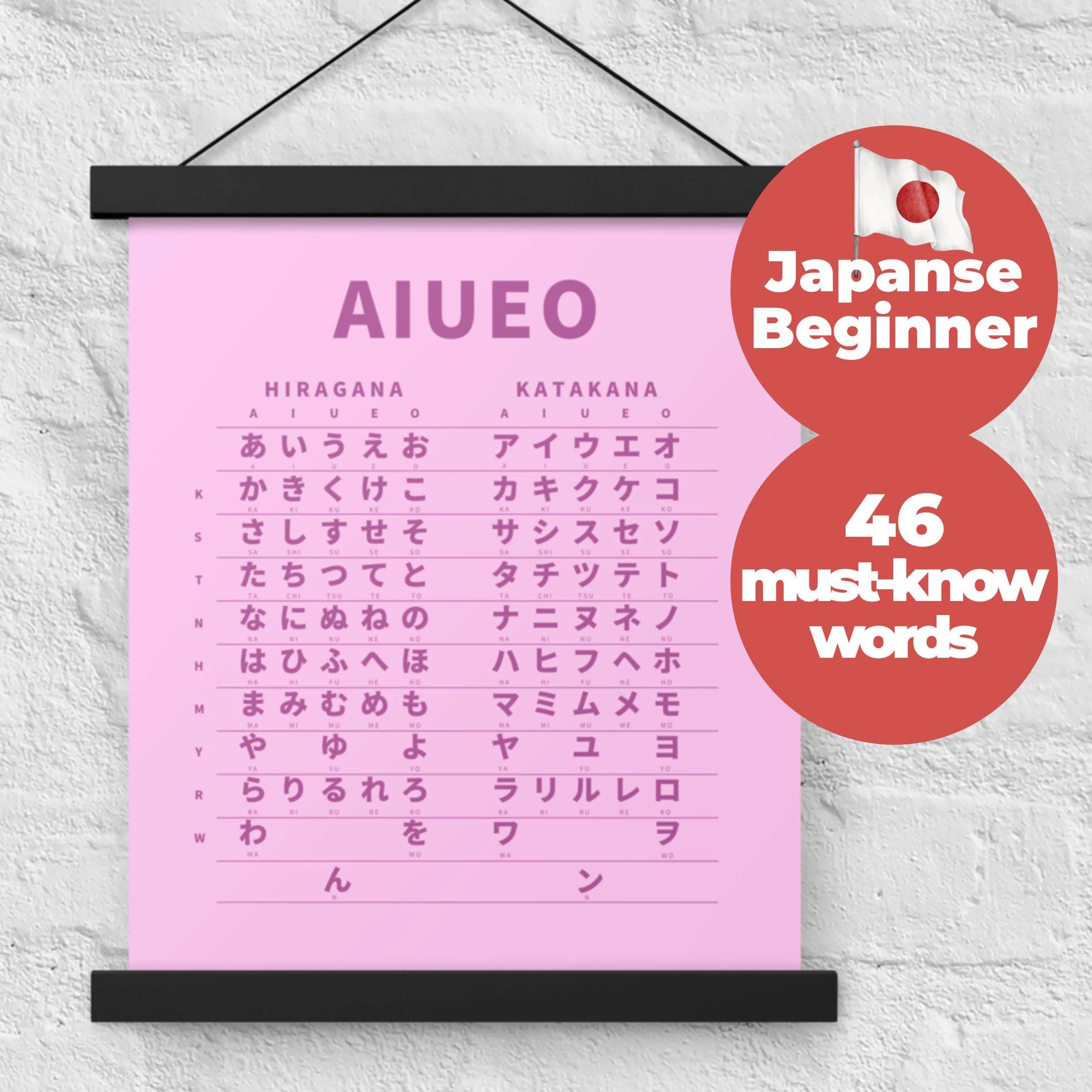 Japanese Hiragana Katakana chart with wooden hangers, perfect for Japanese beginners and learners as study wall art. Always great to have the Hiragana table by your desk to reference the essential Japanese alphabet.