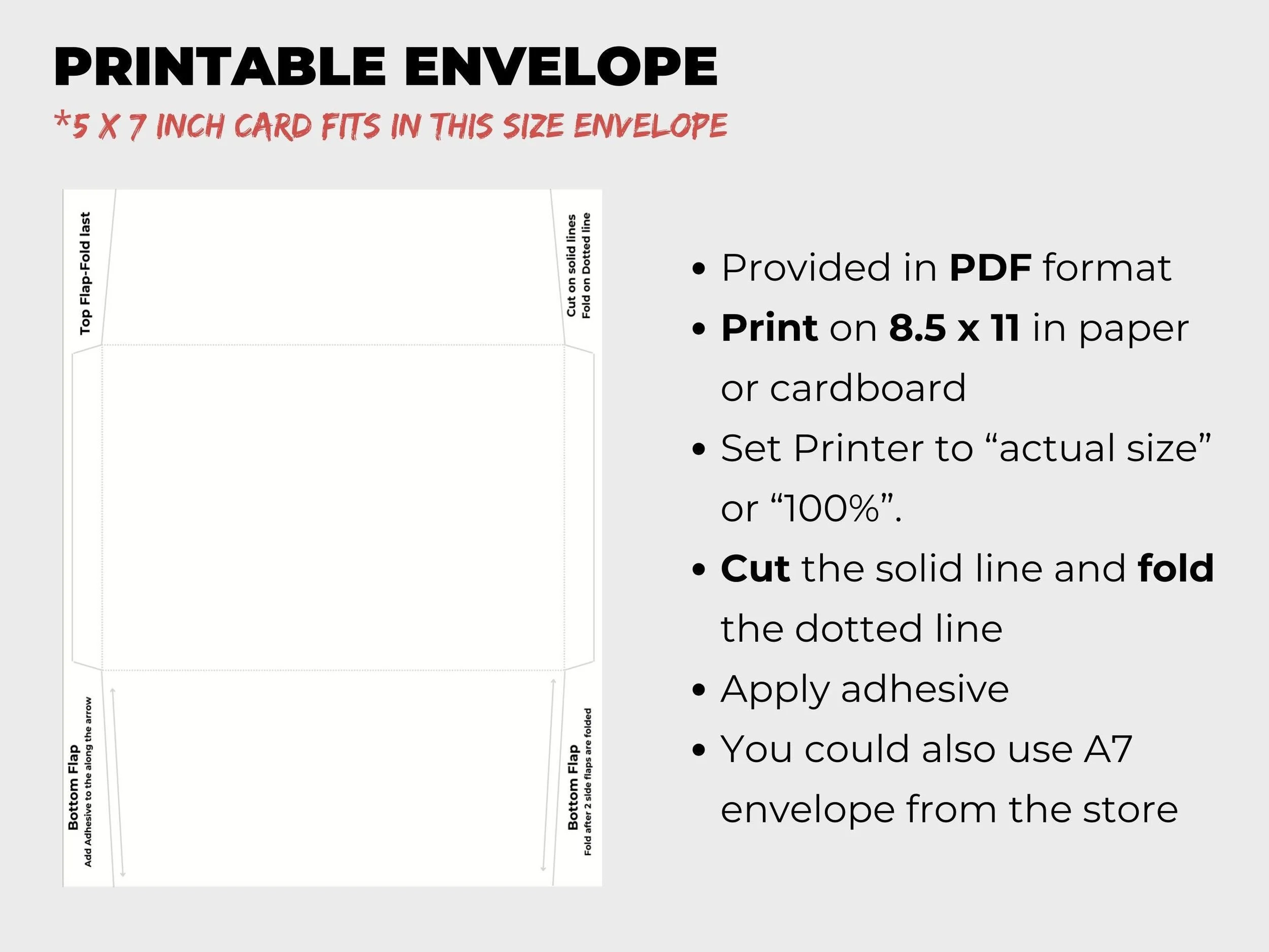 Print this card out on 8.5in by 11in paper or cardboard. When printing, please choose one of the following options depending on the choices presented to you: "ACTUAL SIZE", 100%, FILL PAGE, or CROP. This will ensure that the PDF prints to the correct cut size of 5in by 7in.