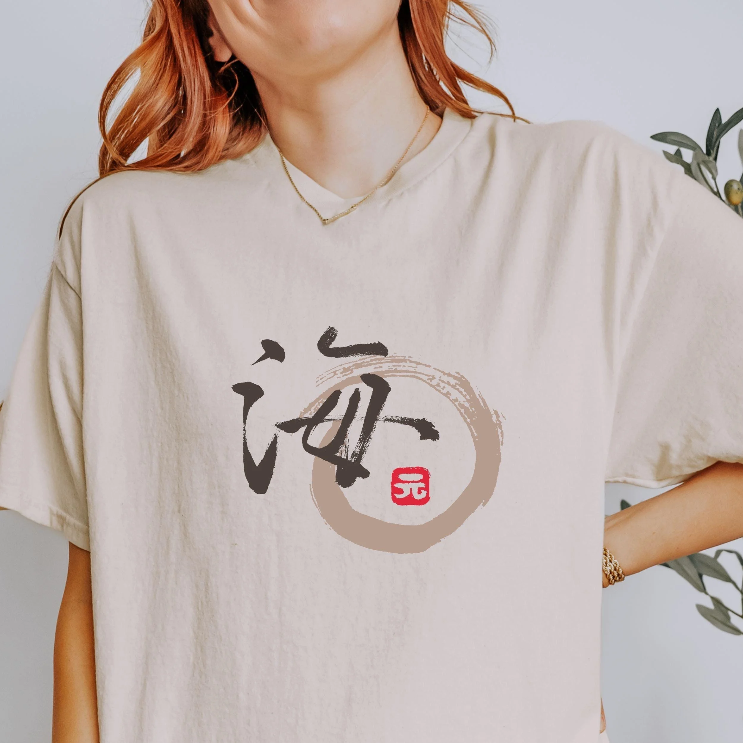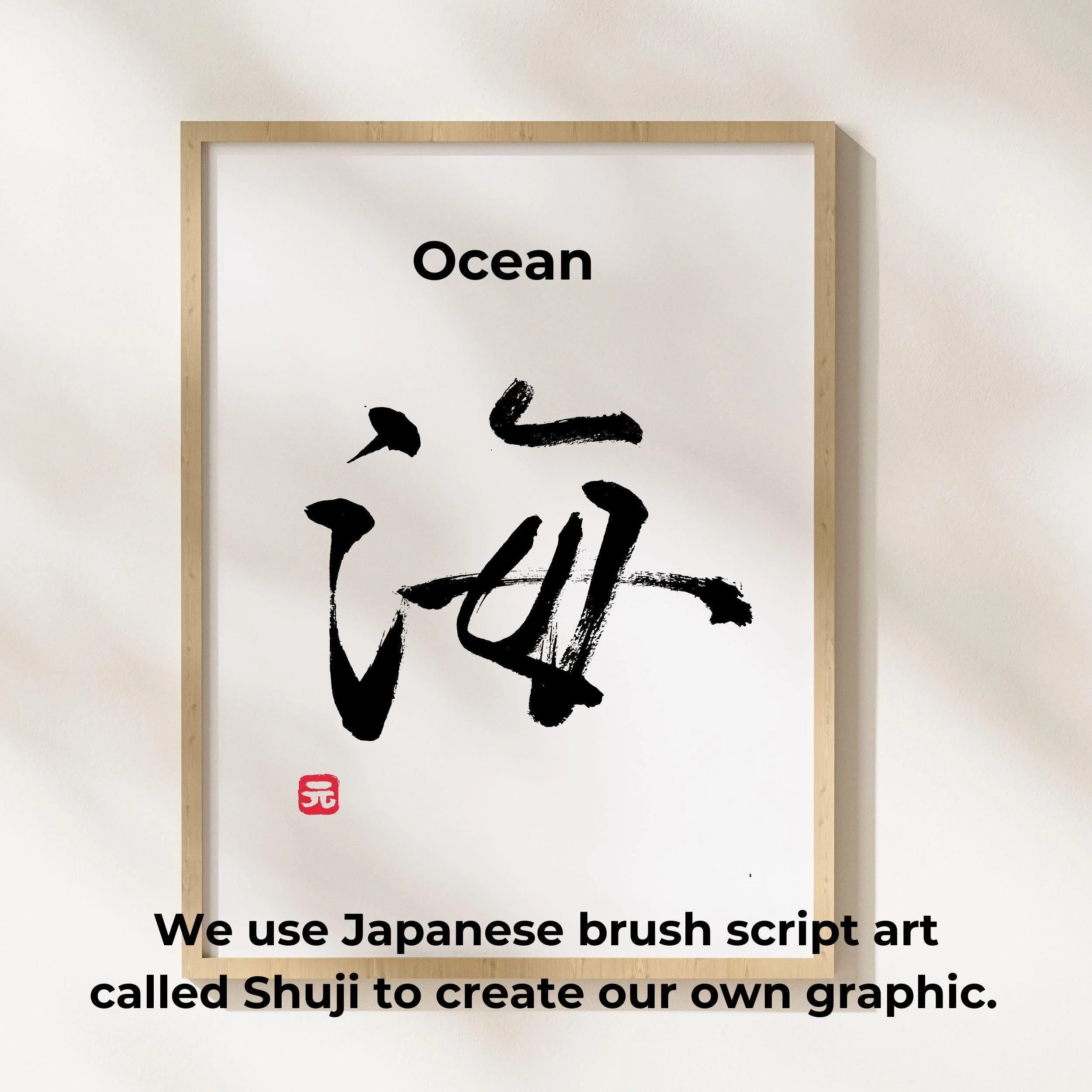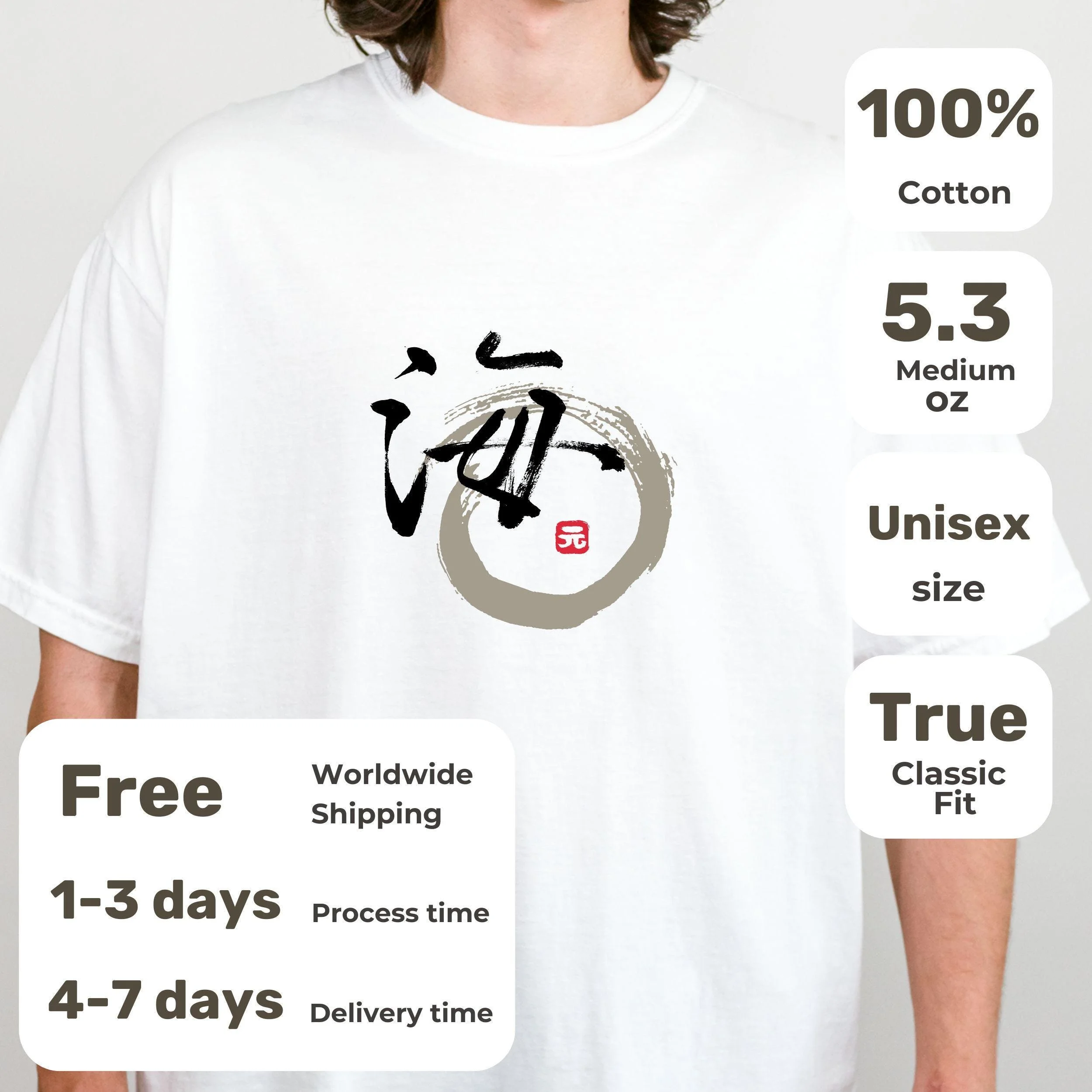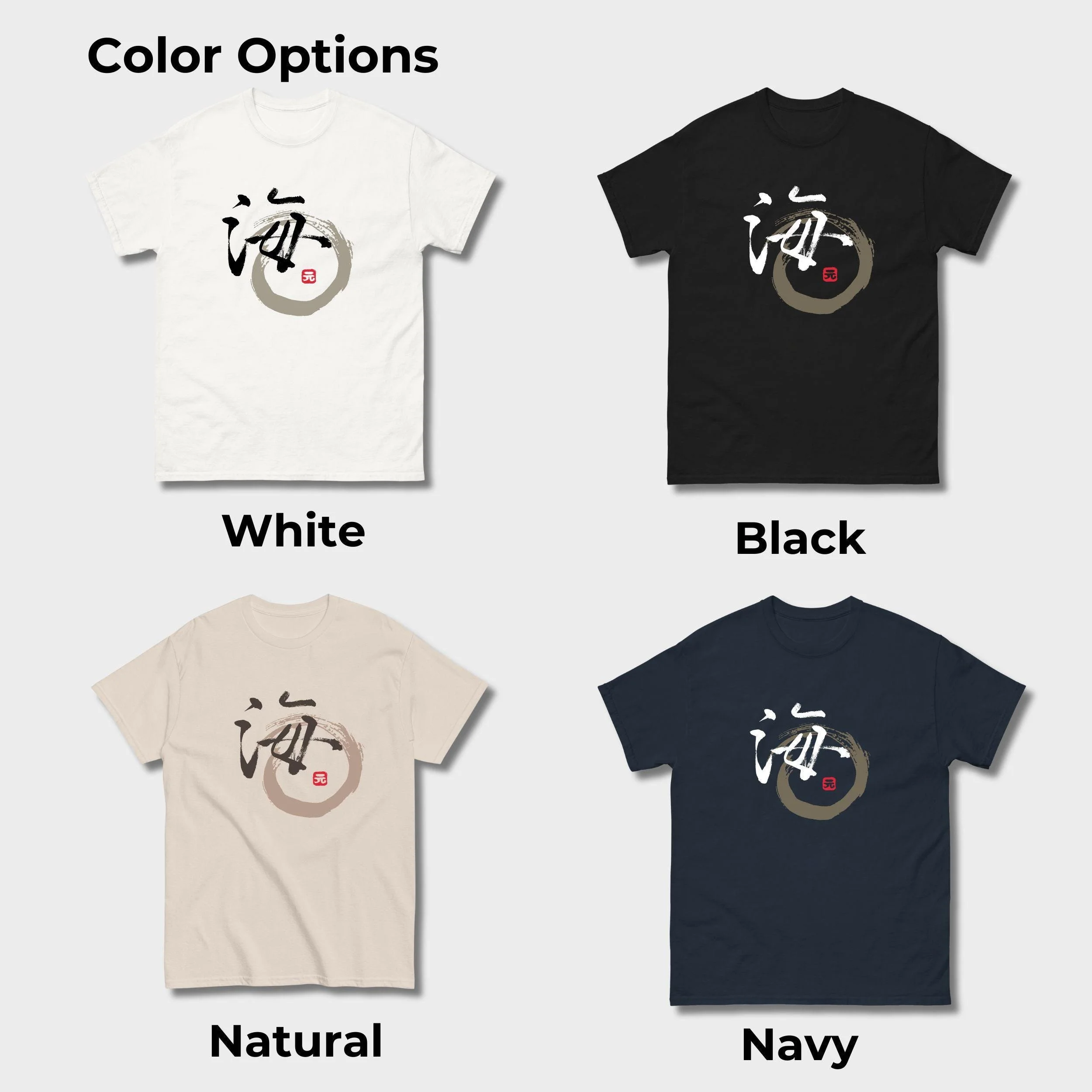 This Japanese script T-shirt says "Ocean" in Japanese calligraphy. We hand draw it with the brush stroke traditional "Shuji" technique and made it into a shirt with enso circle.