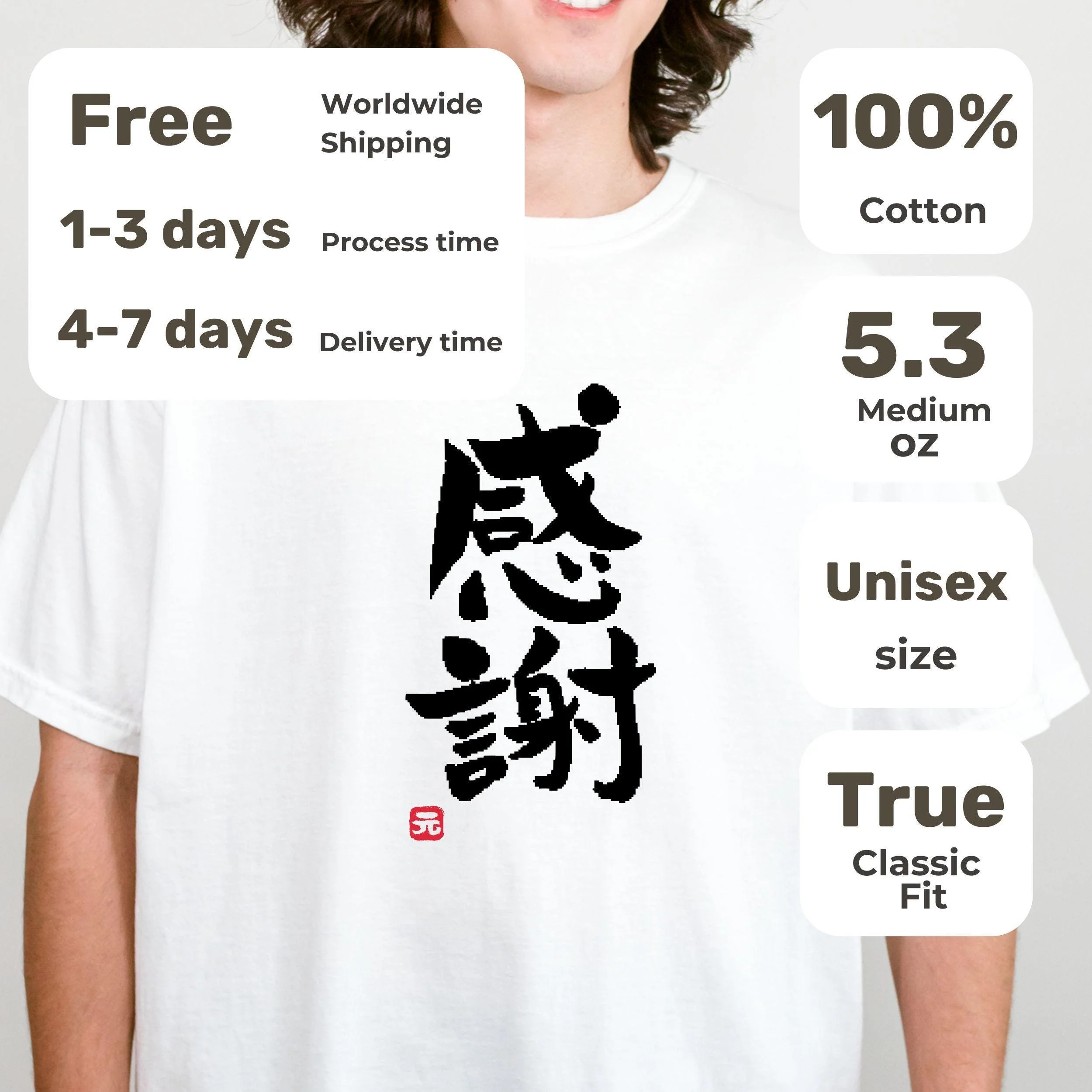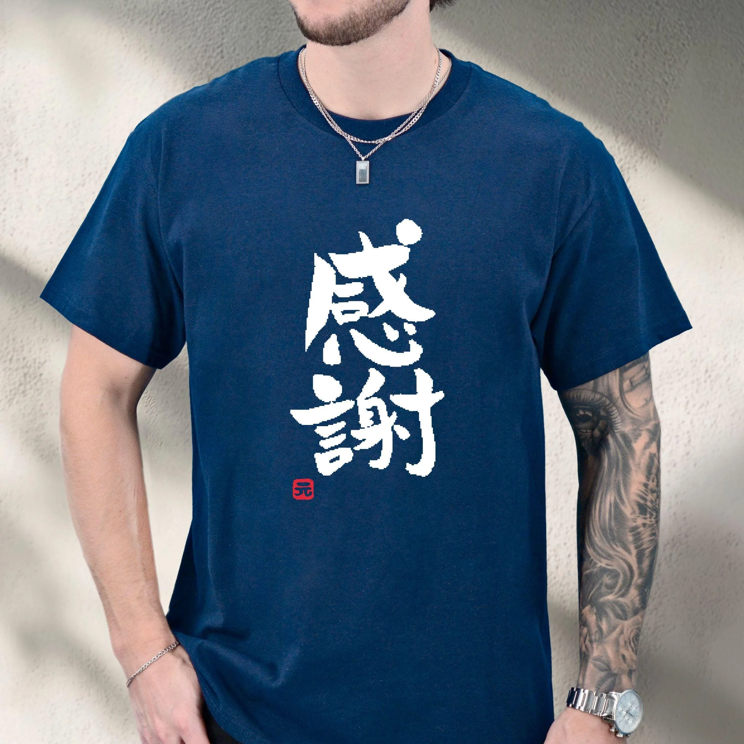 This Japanese script T-shirt says "Appreciation-Thank you" in Japanese calligraphy. We hand draw it with the brush stroke traditional "Shuji" technique and made it into a shirt with our brand hanko stamp logo.