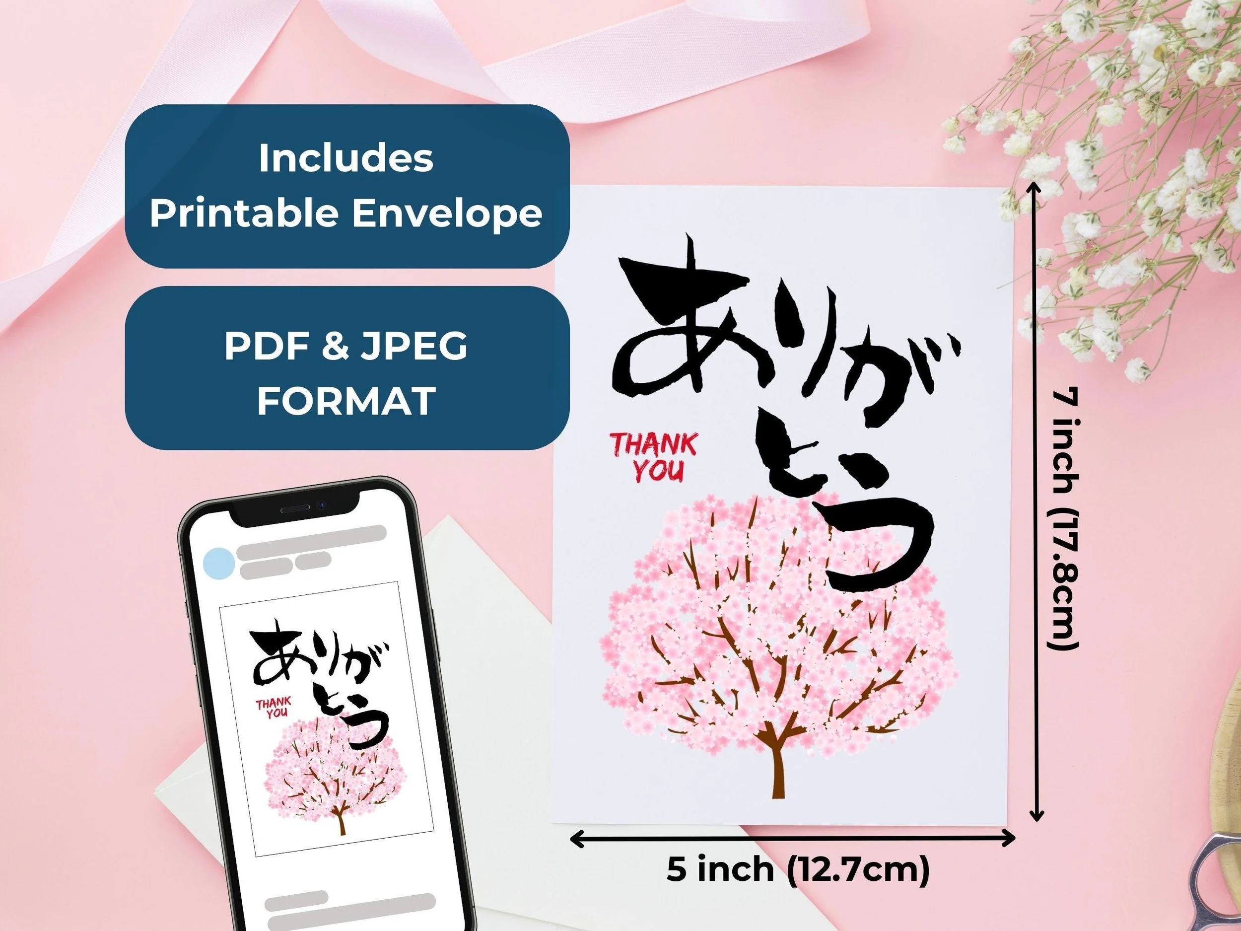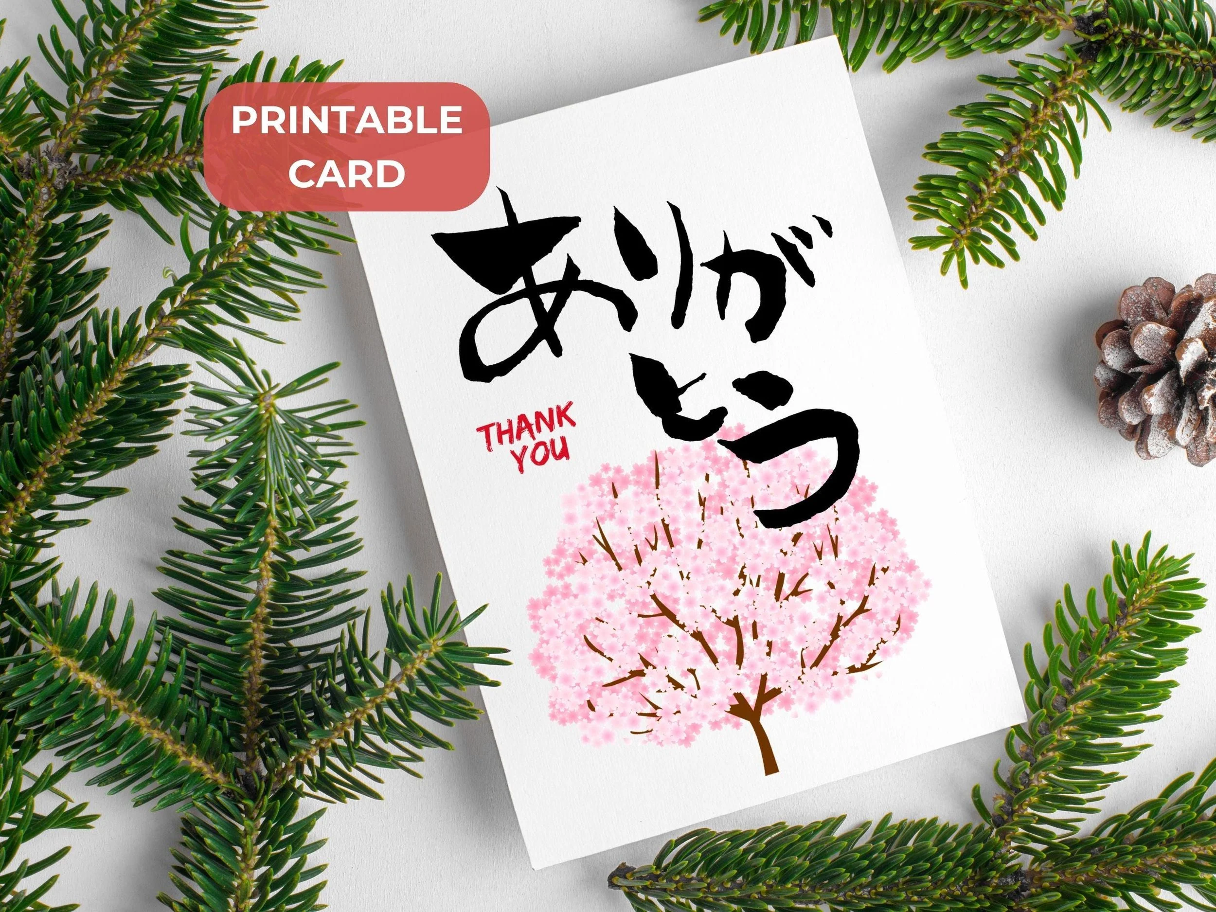 Printable thank you card features a Japanese calligraphy, saying "thank you" in casual form sentence. Cherry Blossom "Sakura" Tree adds a touch of Japanese art and the essence of spring or new beginning for our soul. Great way to say thank you to your Japanese teachers or students or cherry blossom lover.