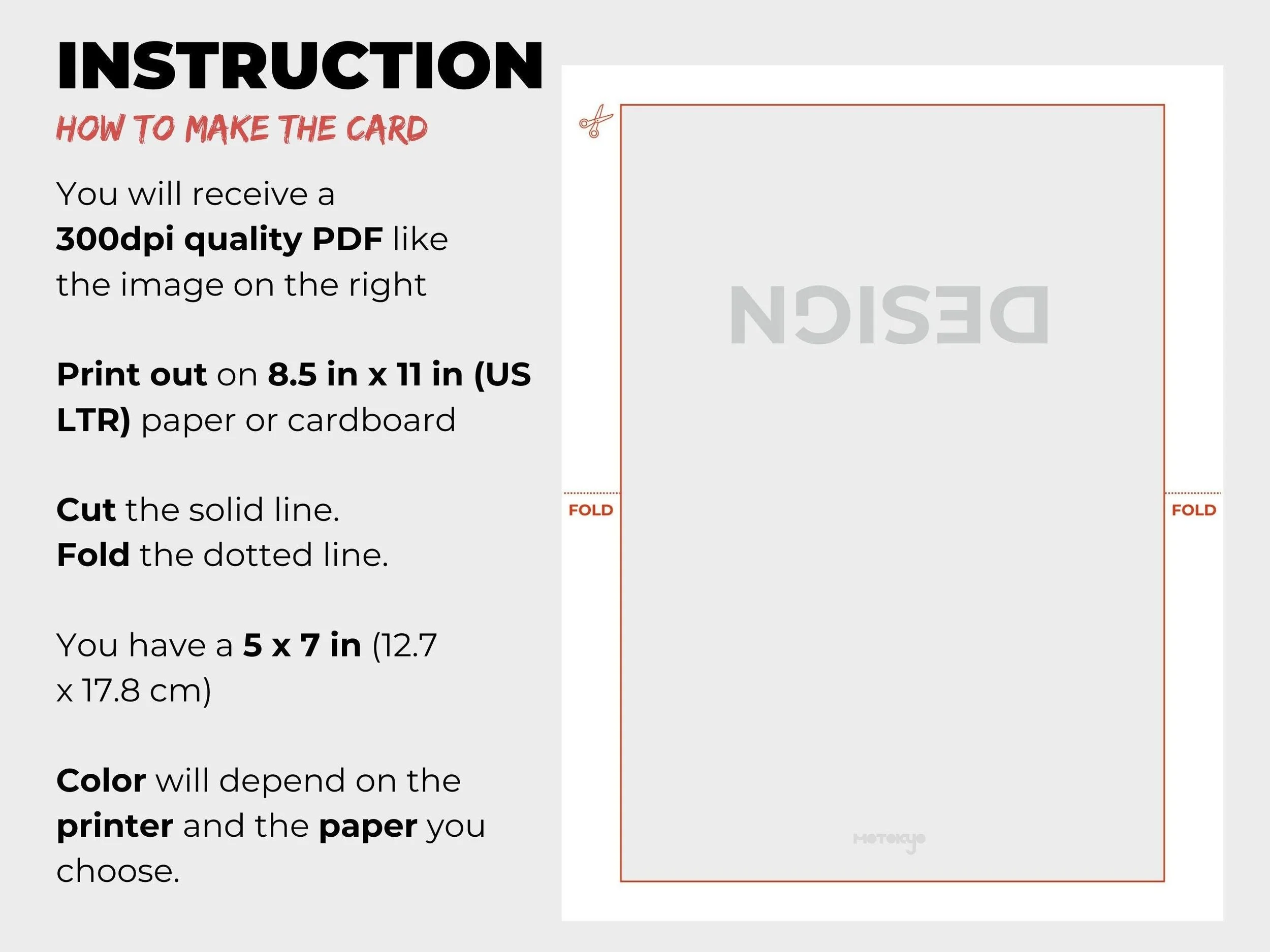 Print this card out on 8.5in by 11in paper or cardboard. When printing, please choose one of the following options depending on the choices presented to you: "ACTUAL SIZE", 100%, FILL PAGE, or CROP. This will ensure that the PDF prints to the correct cut size of 5in by 7in.