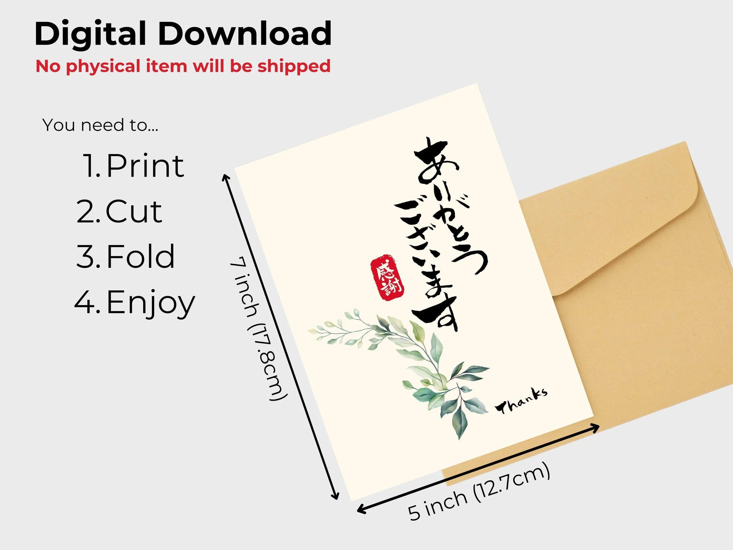 This digital "thank you" card features Japanese calligraphy with elegant brush strokes, perfect for expressing gratitude to Japan lovers or Japanese friends and family. It’s a printable card available as an instant download, so you can use this forever as you print out.