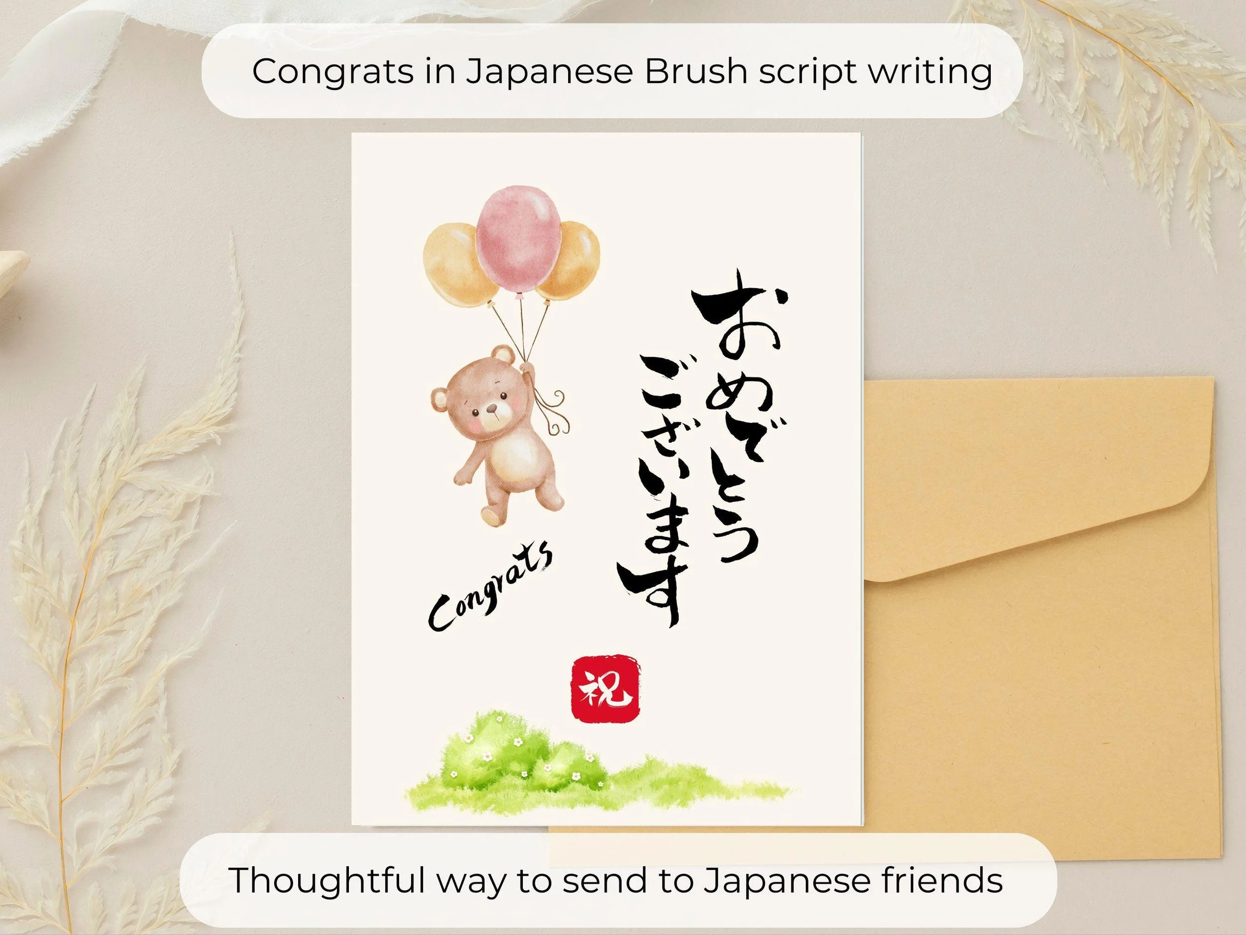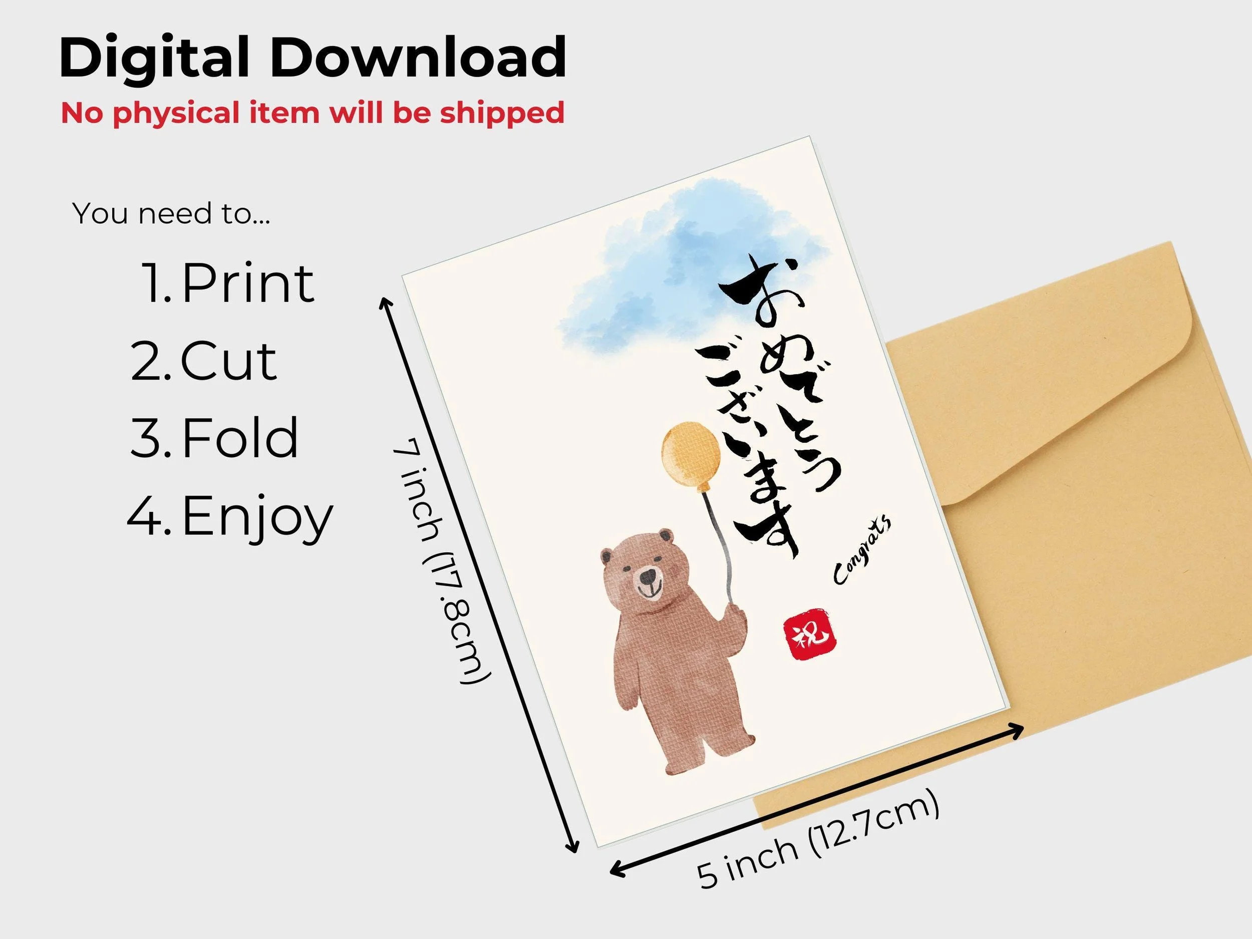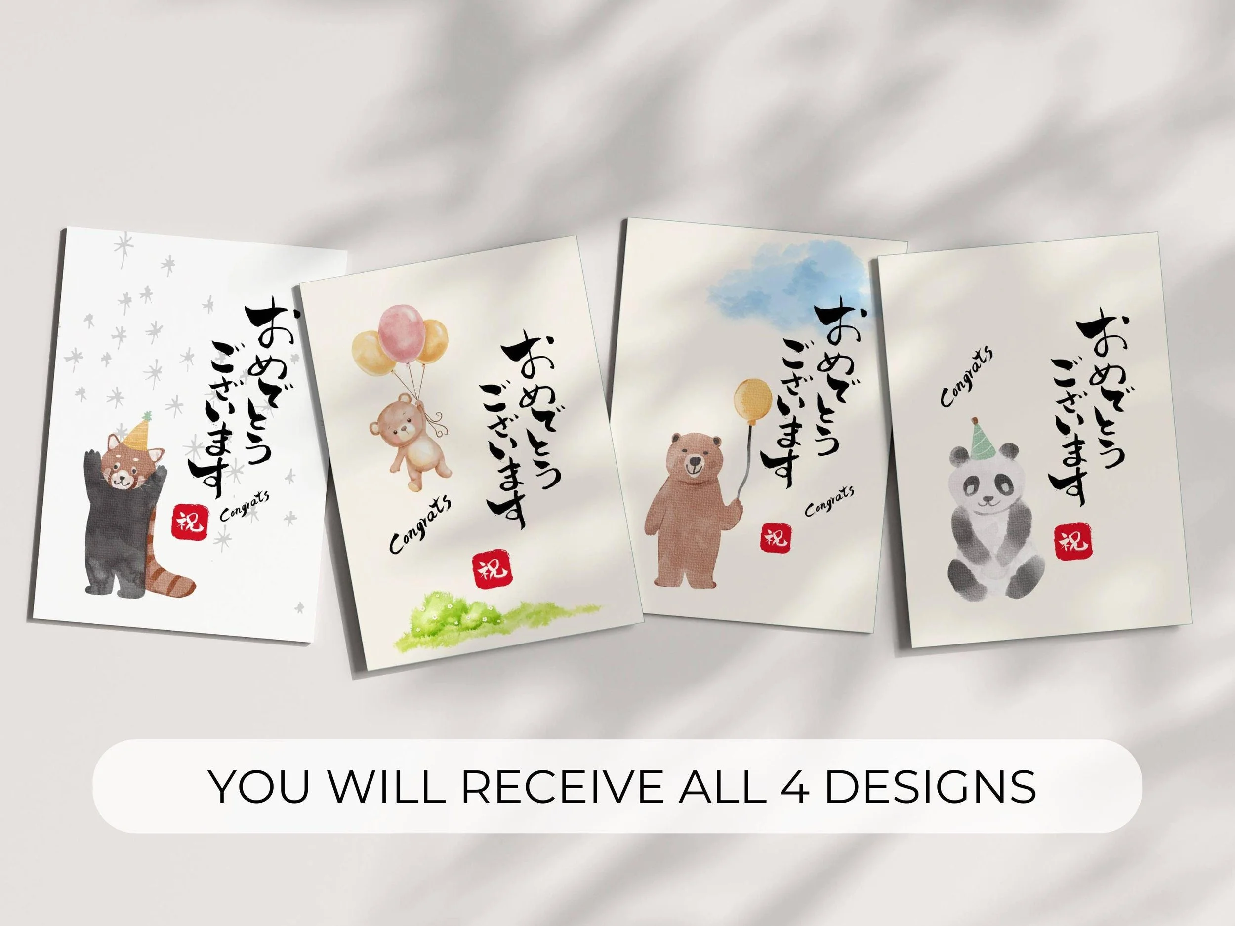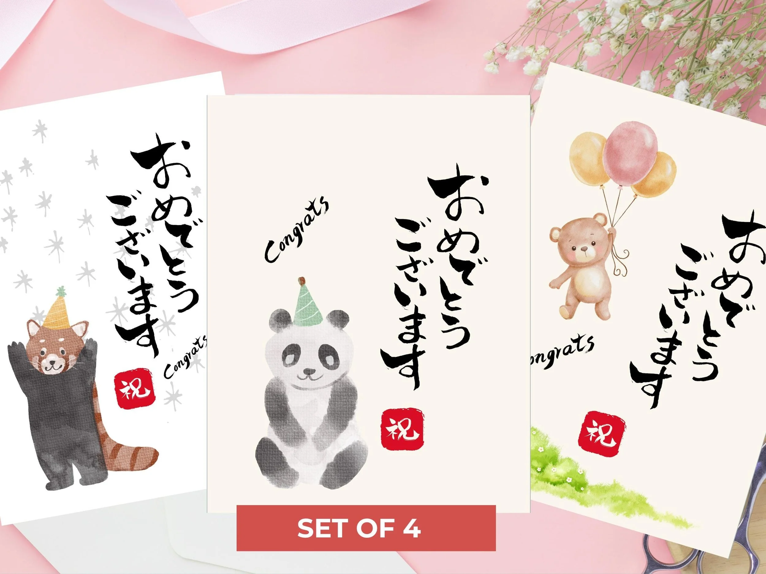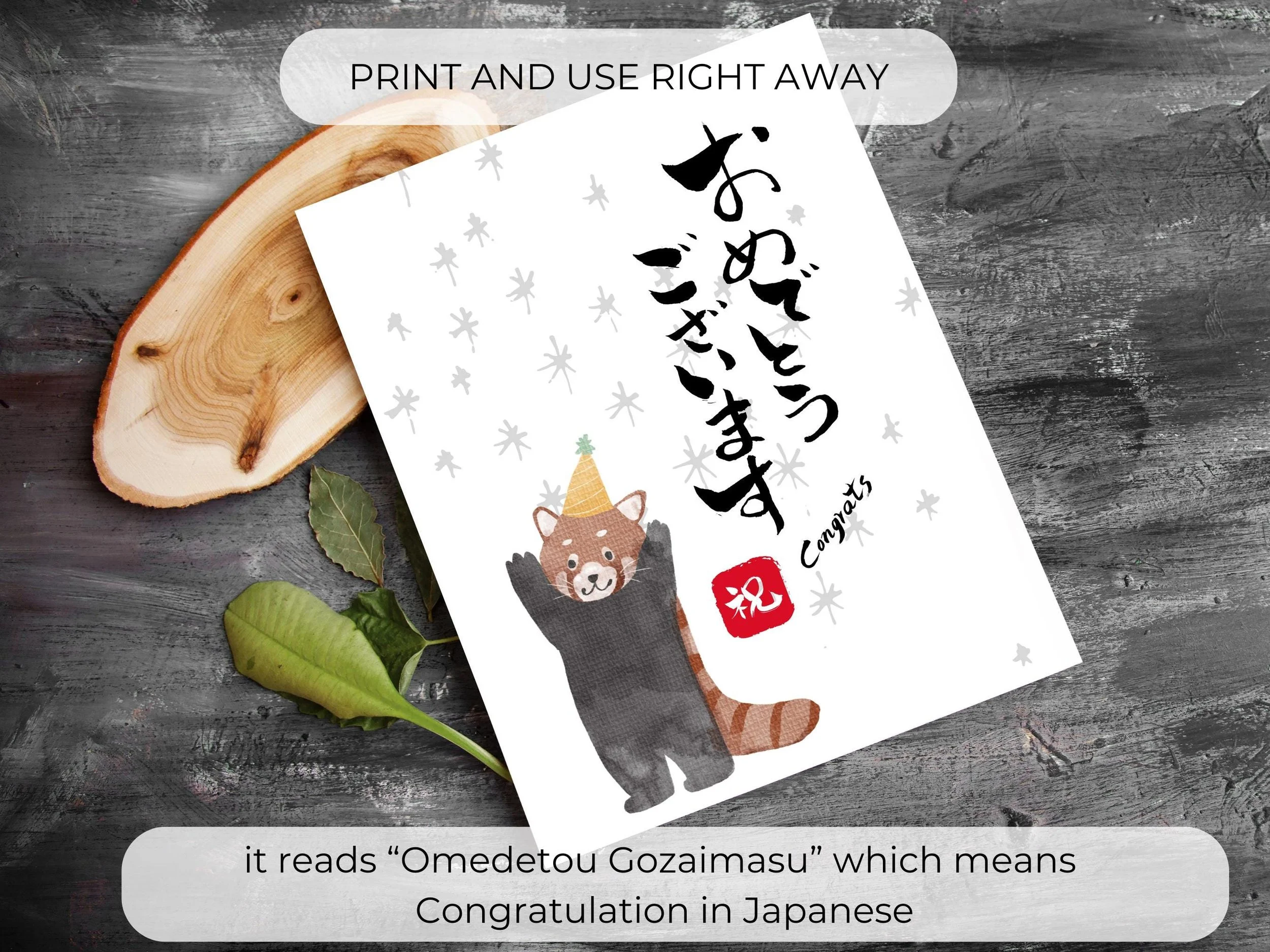 This digital congratulations card showcases an animal watercolor graphic with Japanese calligraphy brush stroke design, saying congrats in both English and Japanese. It’s perfect for special celebrations such as wedding, marriage, graduation or birthdays. Hand drawn brush script adds the emotion to the card.