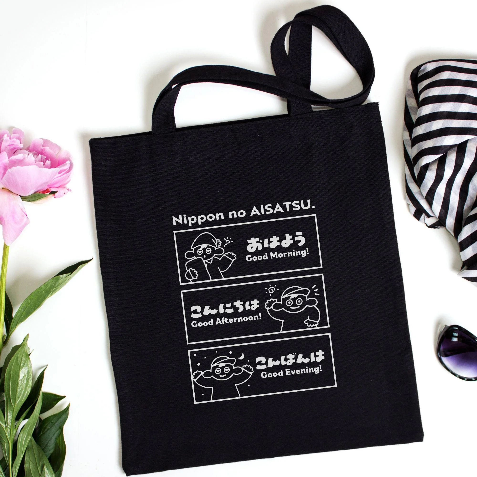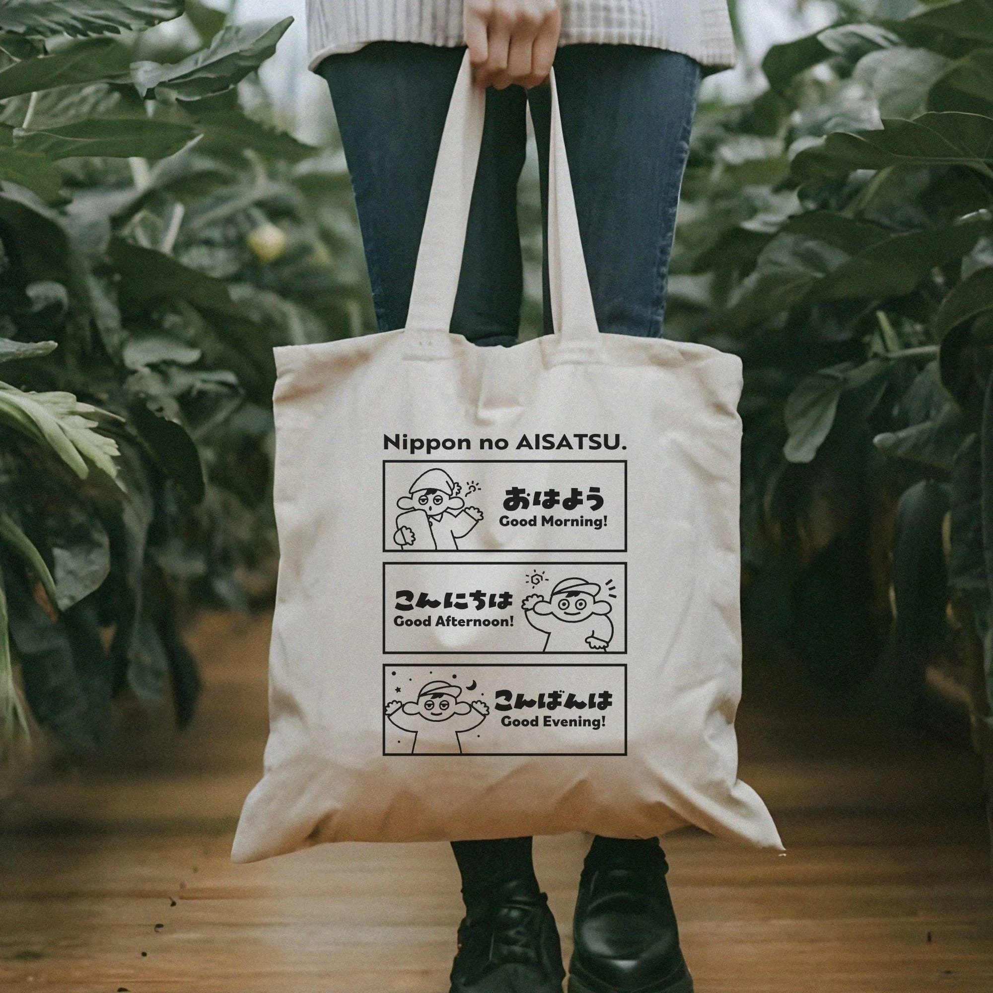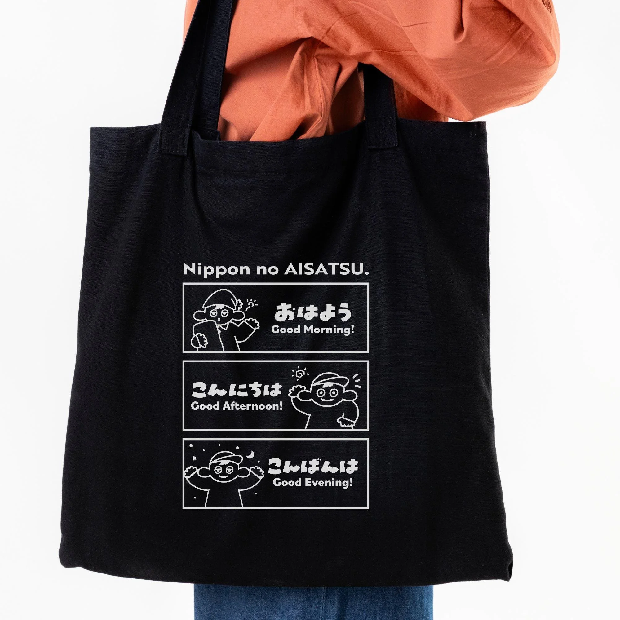 Japanese Greetings Tote Bag: Kawaii Anime Design, Student Travel Bag