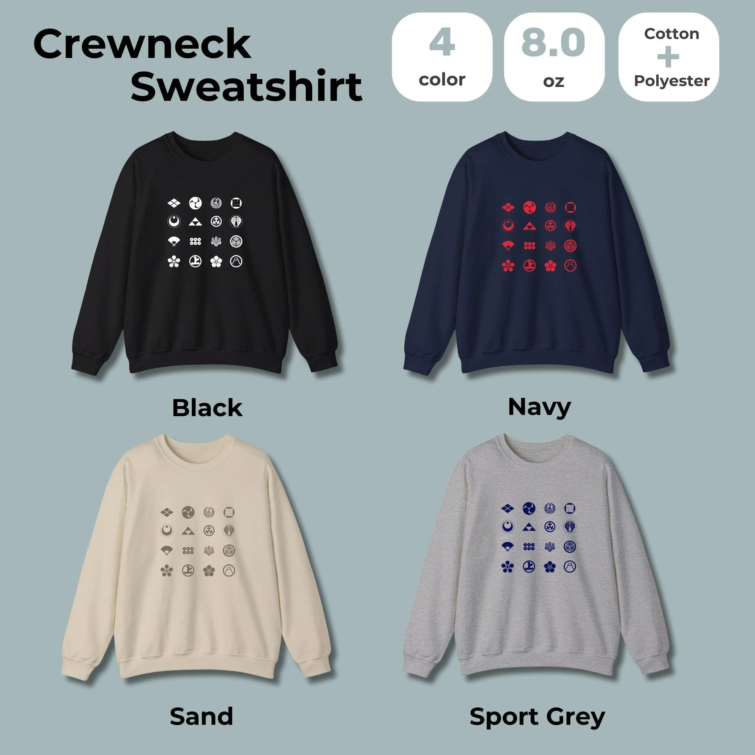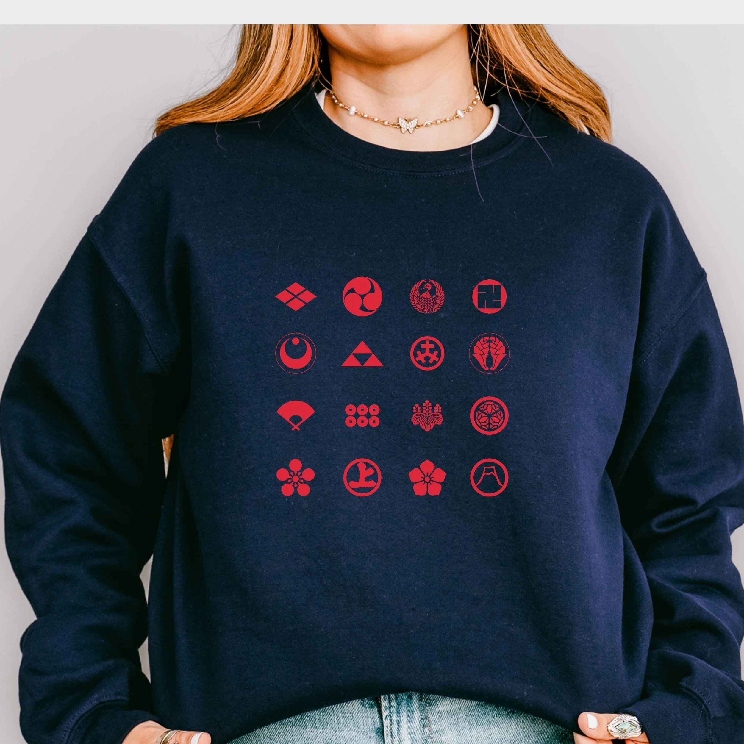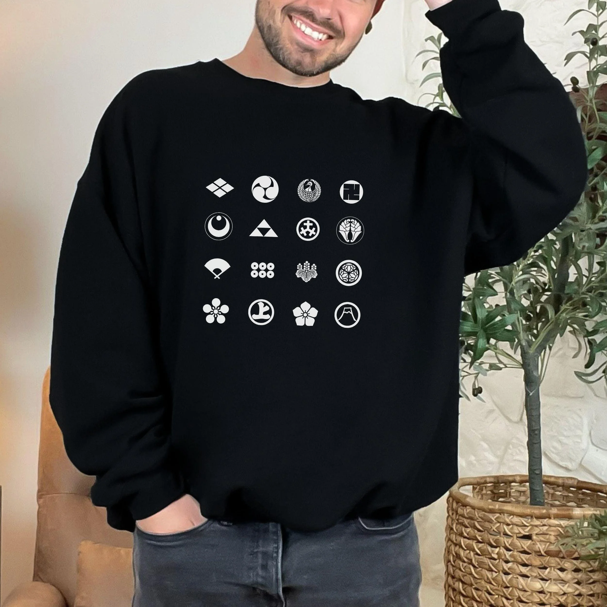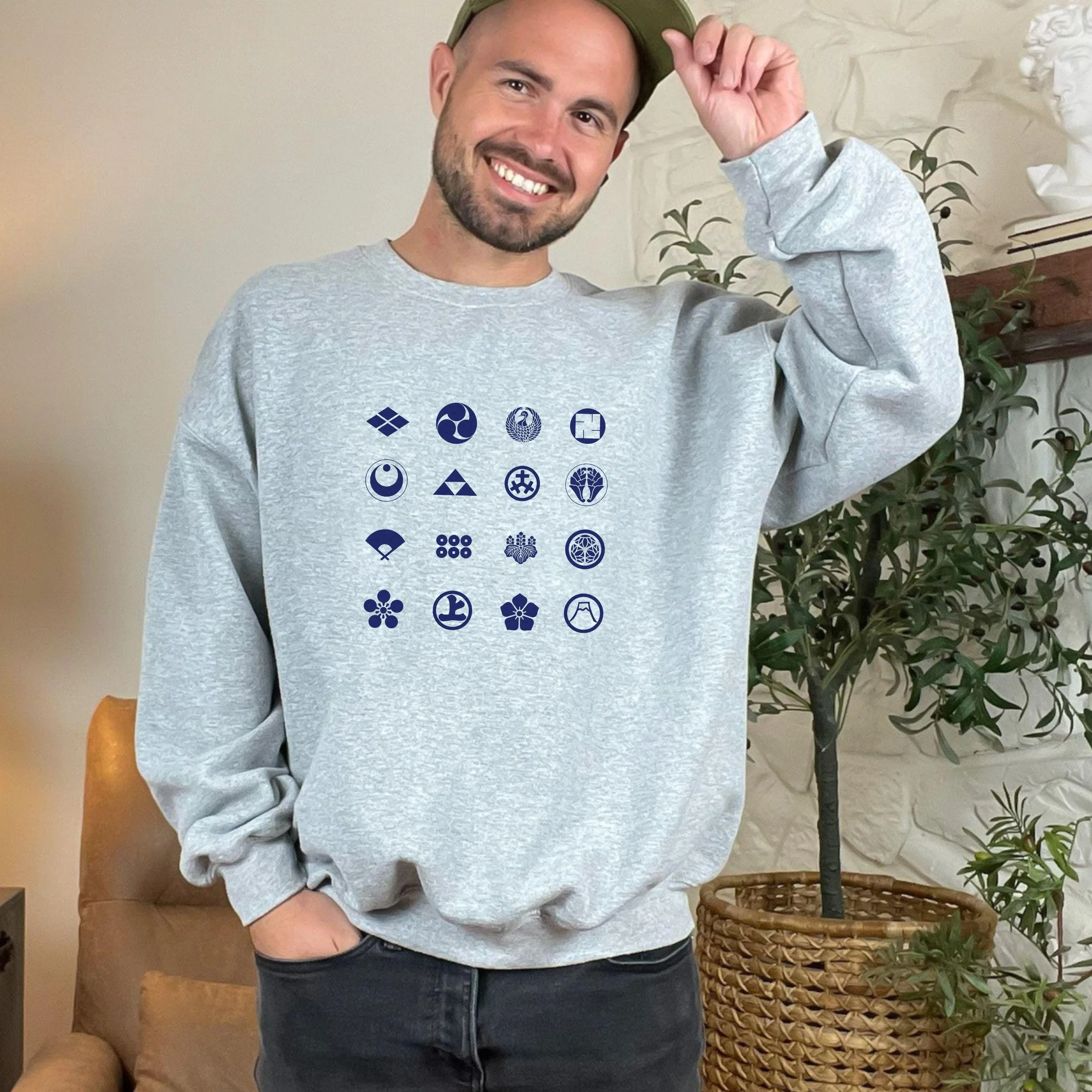 Japanese Mon Crest Sweatshirt representing Shogun Kamon Crest, showcasing a unique Mon art graphic, celebrating Japanese heritage and culture. This crewneck Kamon shirt makes a perfect cultural gift for a Japan lover seeking a meaningful heritage-inspired design of Japanese Art from shogun era.