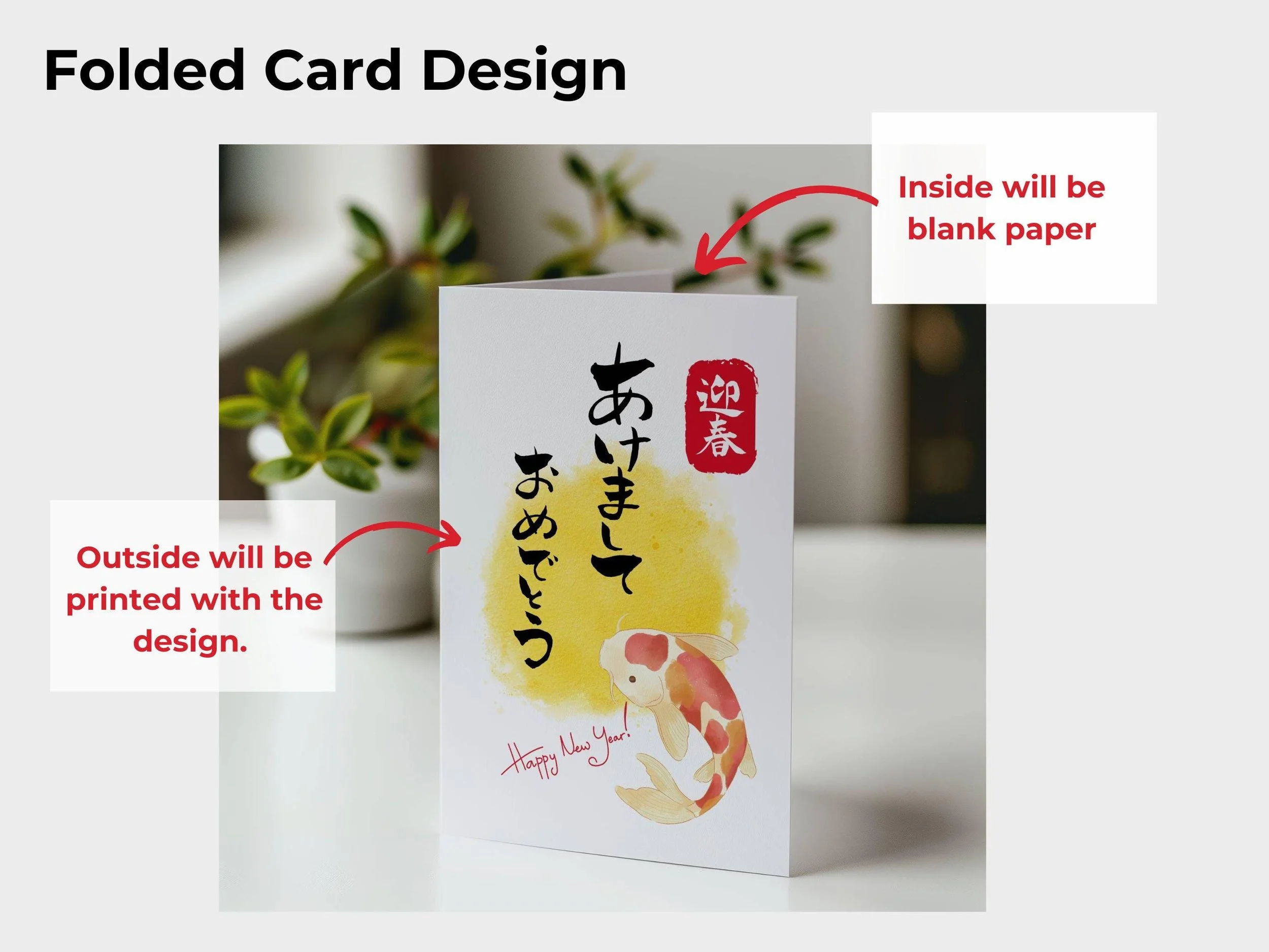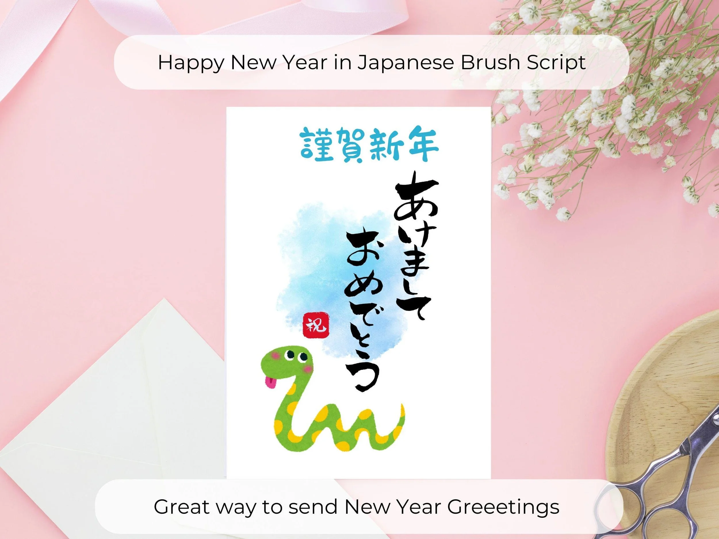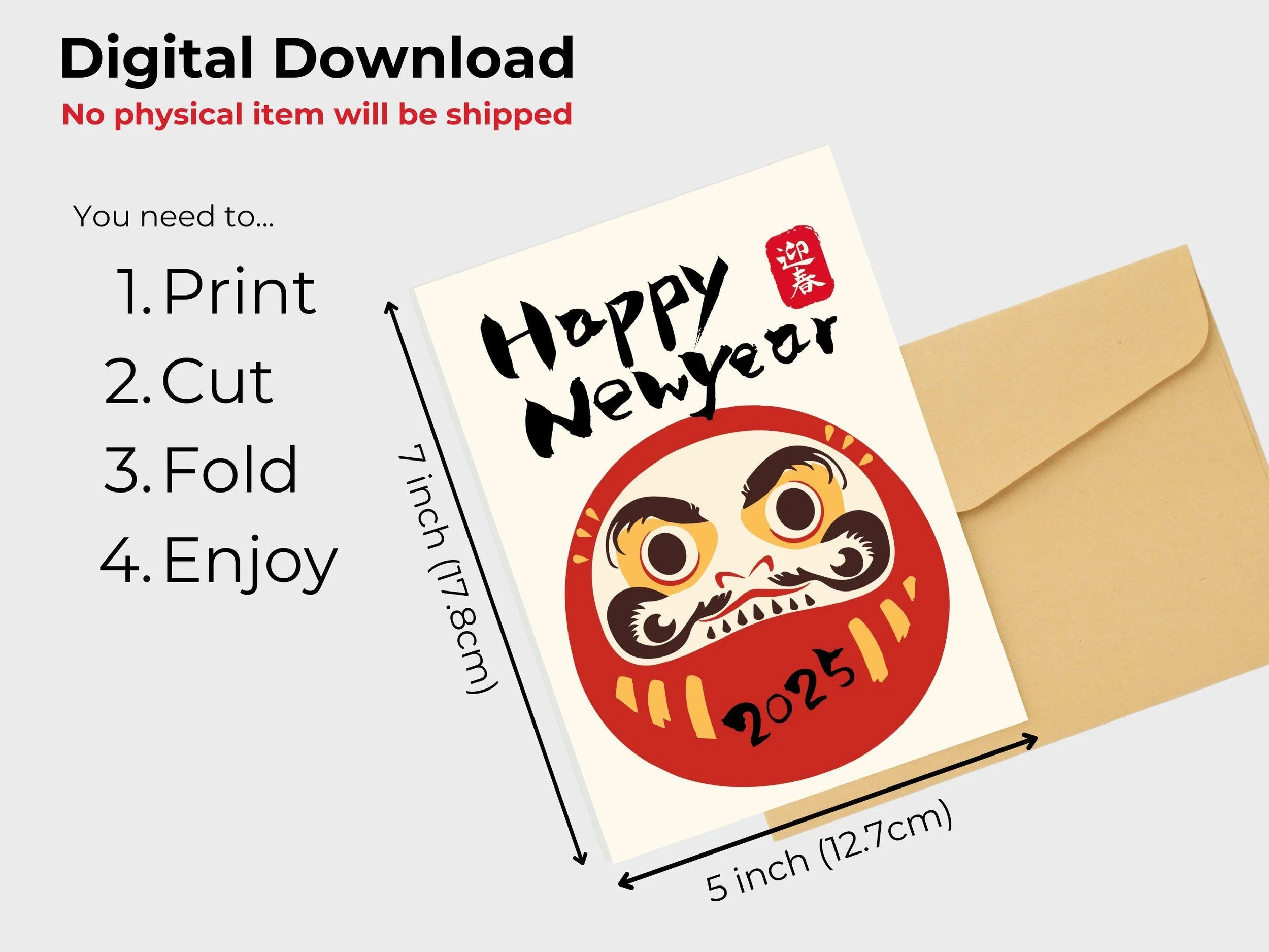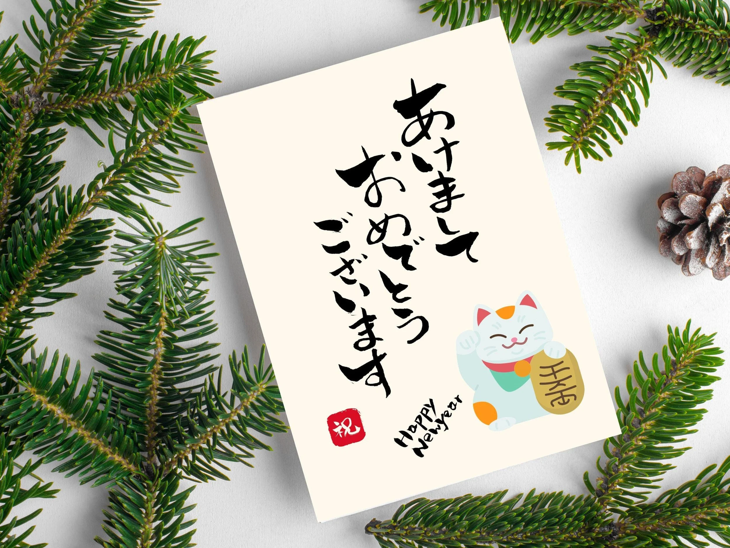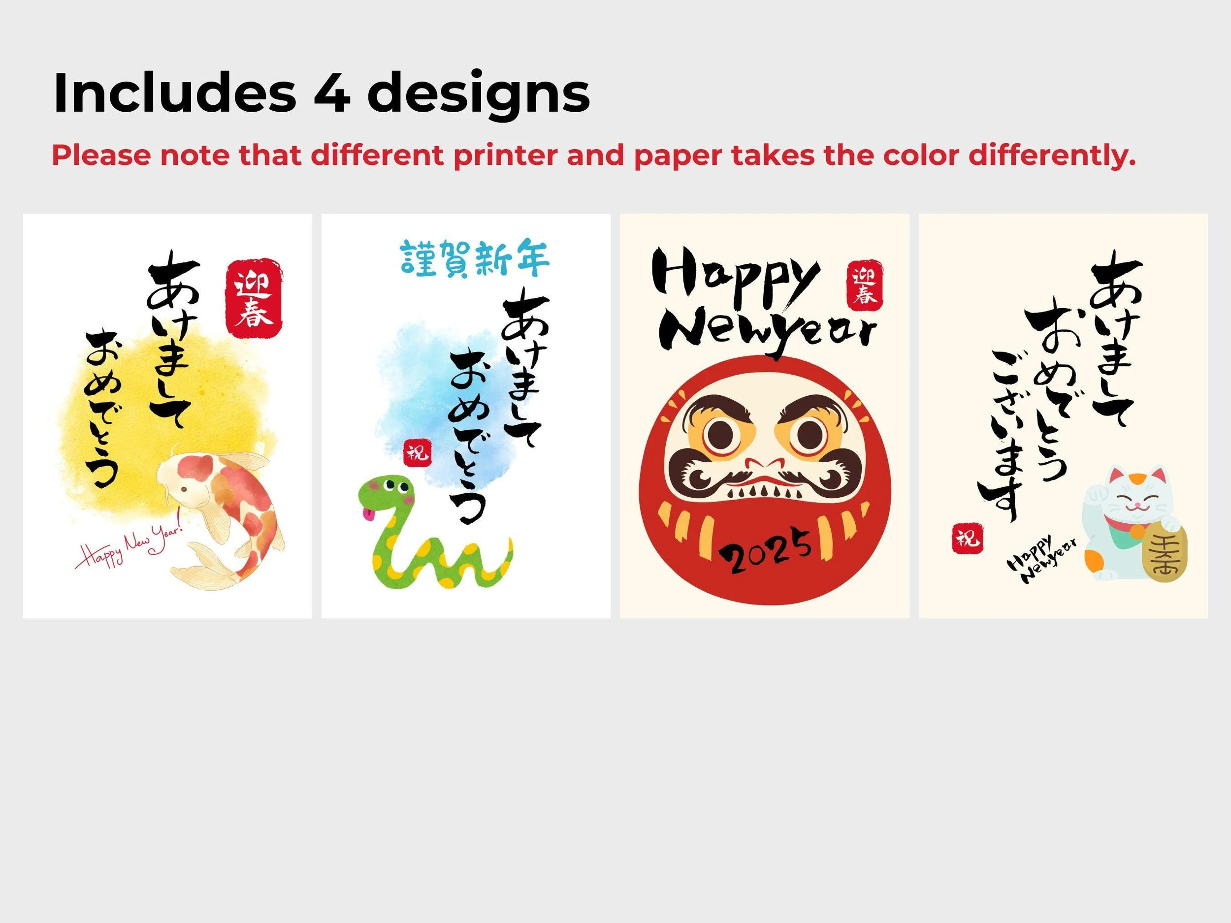 Printable Happy New Year Card features a Japanese New Year greeting with elegant calligraphy, perfect for 2025. This digital download comes with 4 different designs from Koi fish, Manekineko Cat, Year of snake and Daruma.