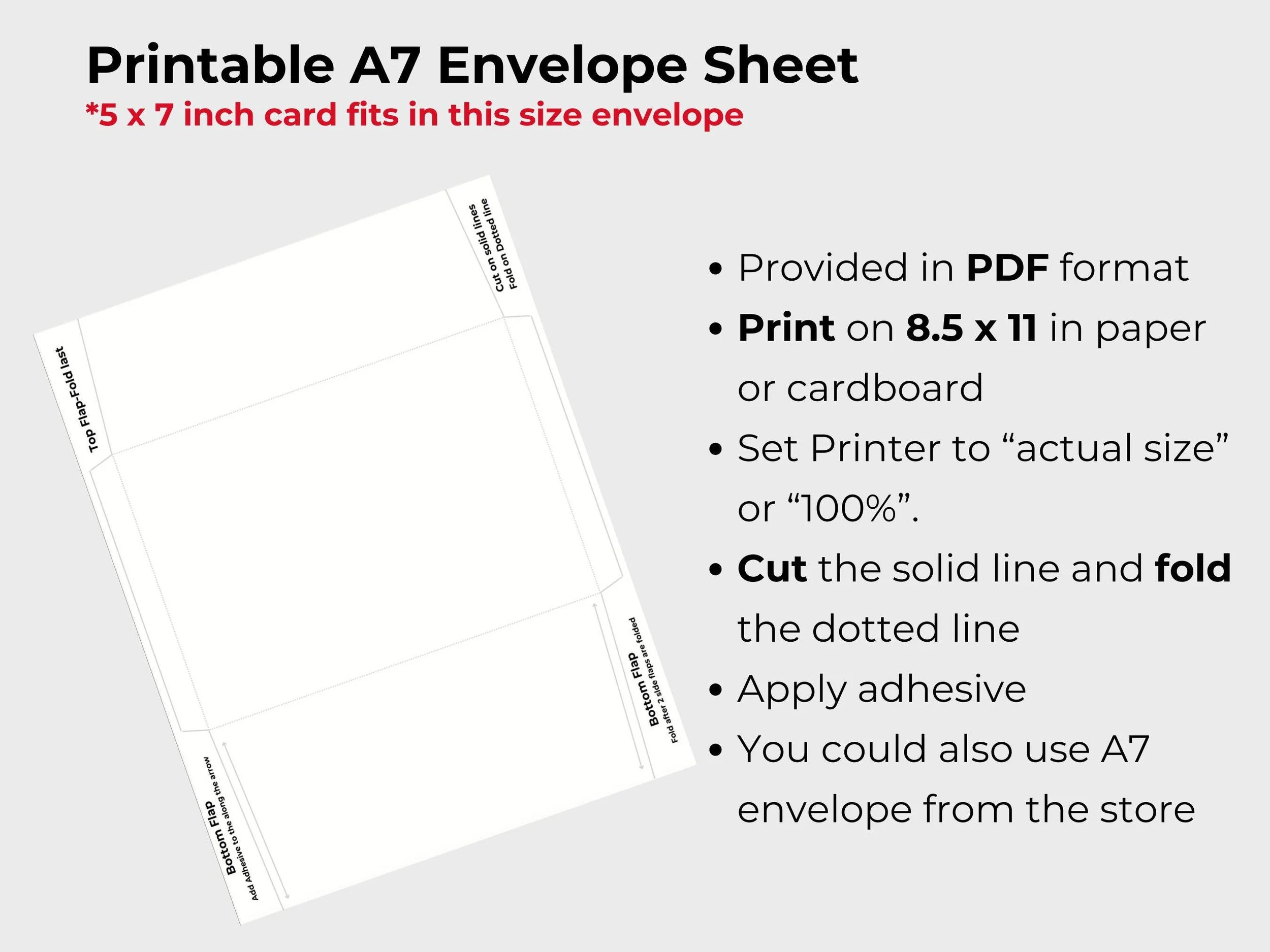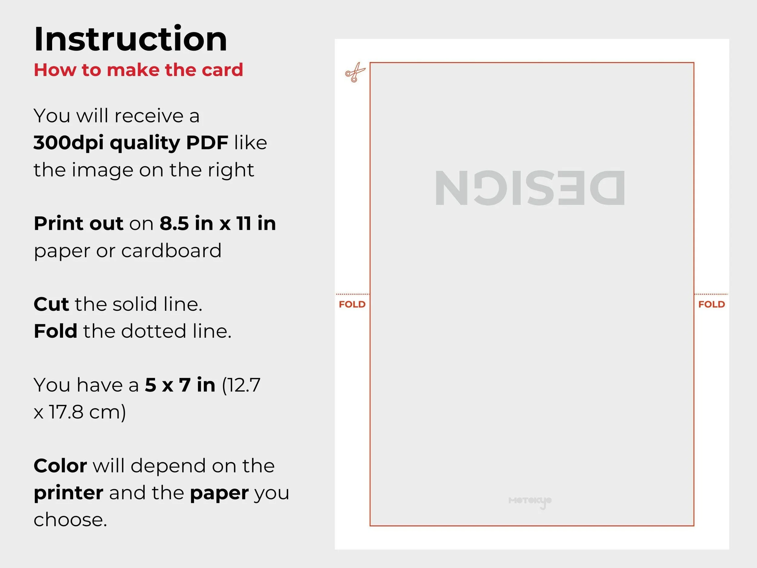 Print this card out on 8.5in by 11in paper or cardboard. When printing, please choose one of the following options depending on the choices presented to you: "ACTUAL SIZE", 100%, FILL PAGE, or CROP. This will ensure that the PDF prints to the correct cut size of 5in by 7in.