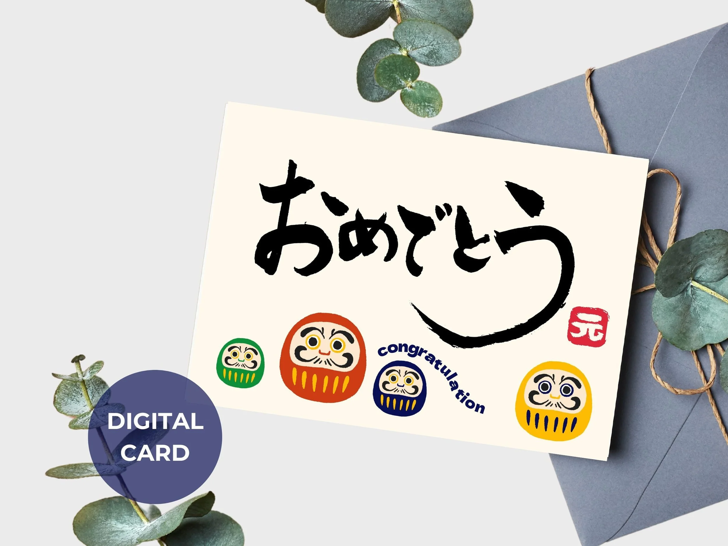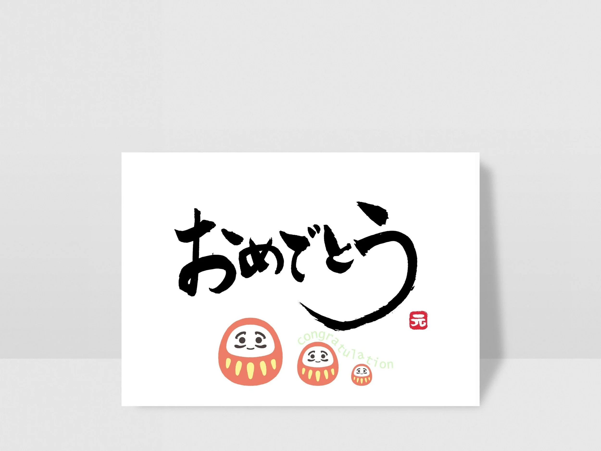 This printable congratulation card with Japanese Hiragana in calligraphy with Daruma design is available as a digital download, making it a perfect choice for a wedding message card, graduation card or anniversary card. It's a thoughtful and unique way to convey congratulations on special occasions.