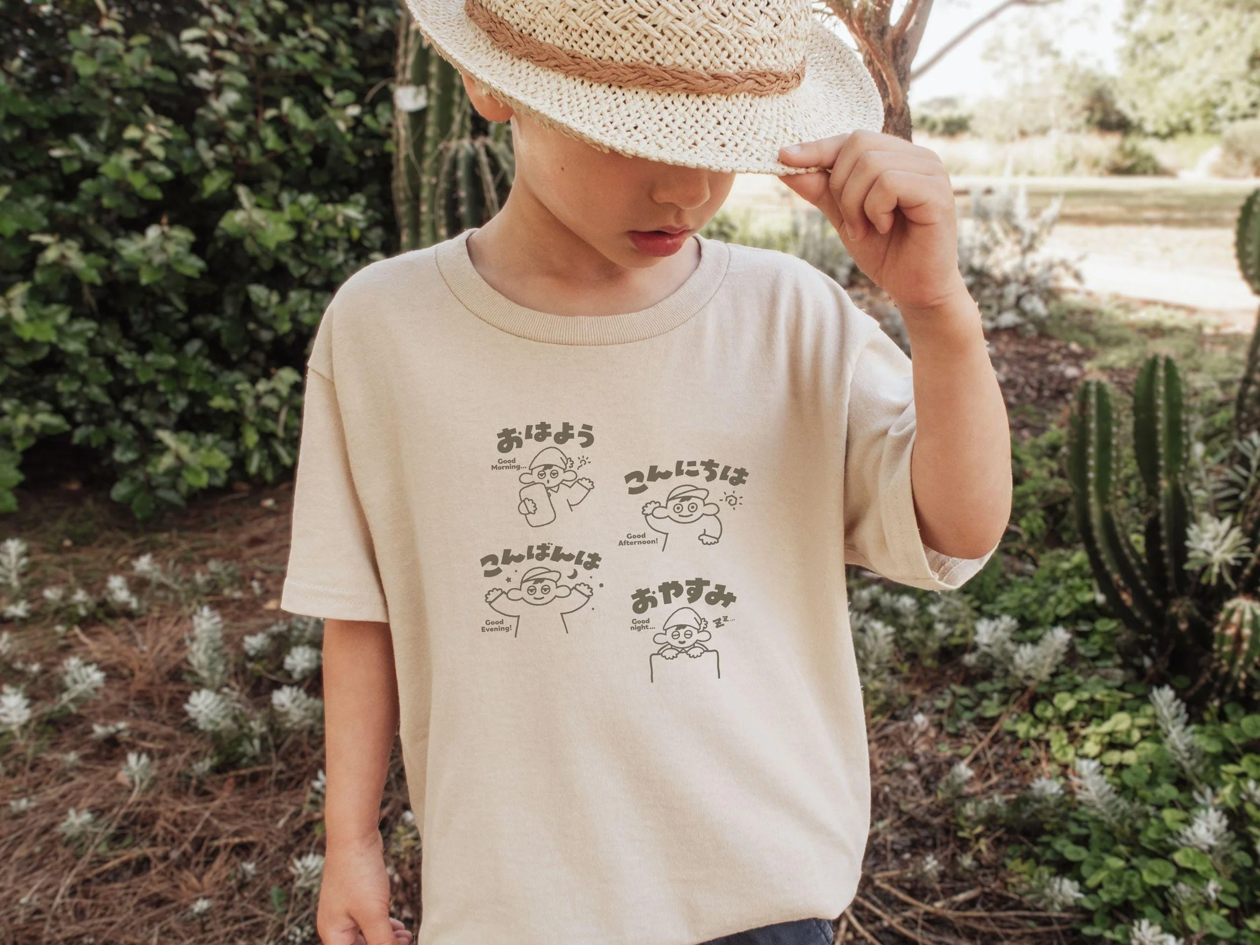 The shirt lists the Japanese basic greetings in Hiragana and English. So you can learn how to say Good morning, Good afternoon, Good evening and Good night in Japanese.