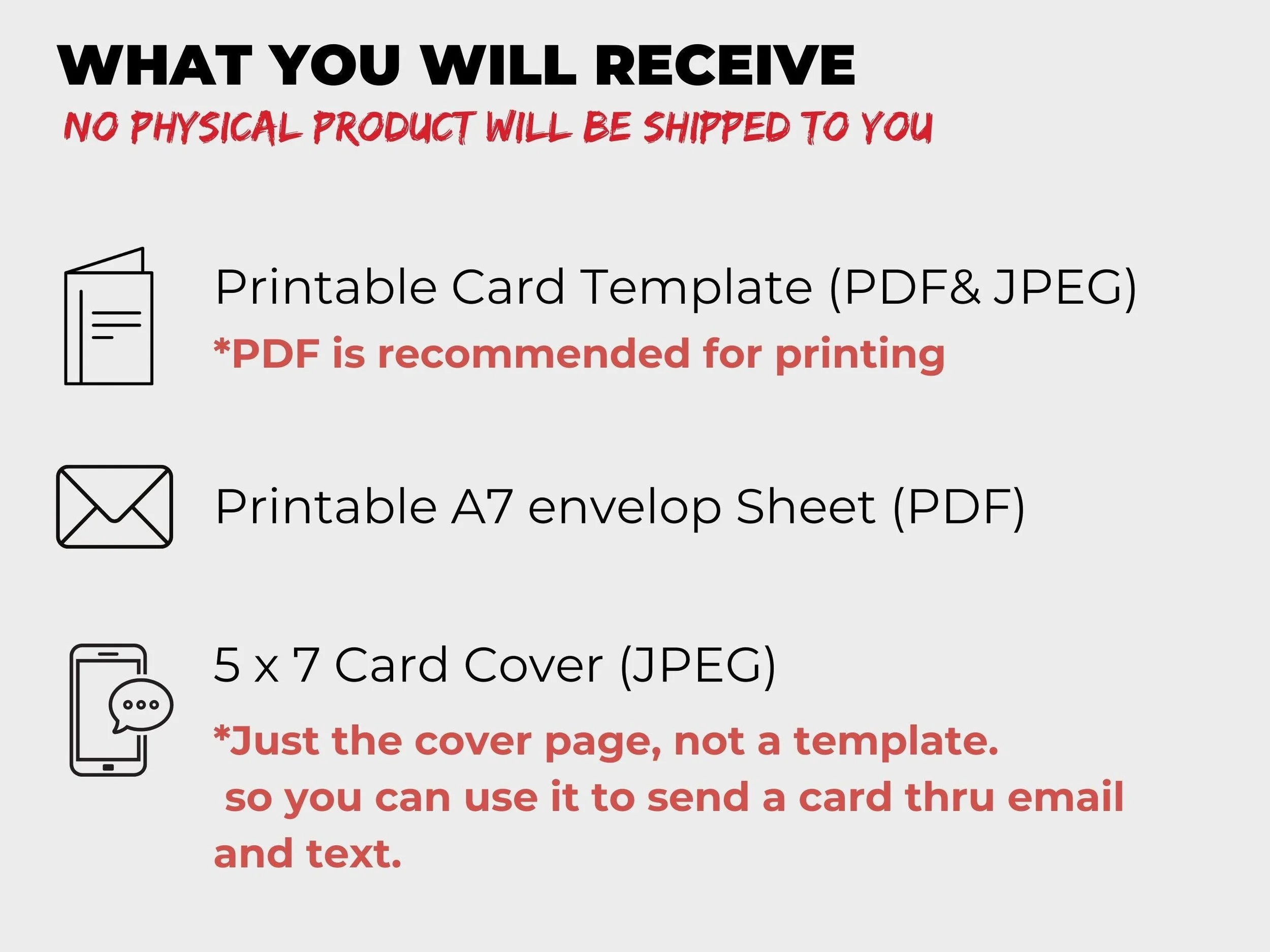 Print this card out on 8.5in by 11in paper or cardboard. When printing, please choose one of the following options depending on the choices presented to you: "ACTUAL SIZE", 100%, FILL PAGE, or CROP. This will ensure that the PDF prints to the correct cut size of 5in by 7in.