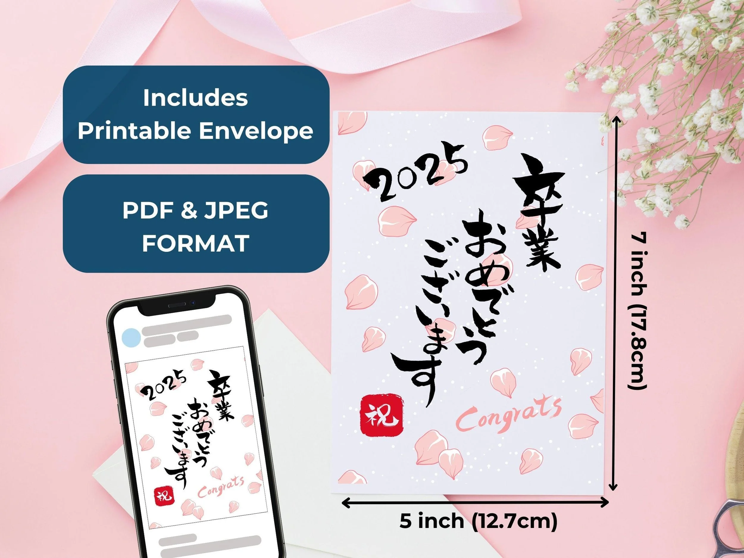 Printable graduation card features a Japanese calligraphy, saying "congratulation on graduation" and cherry blossom Sakura Tree art, which for Japanese brings the moment of graduation. Great way to celebrate the happy moment for Japanese students and class of 2025 grads for their achivement.